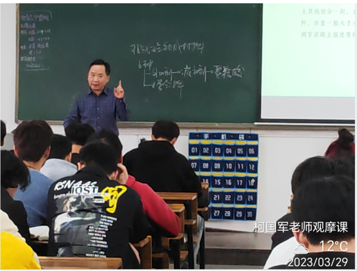 柯教授提前20分钟到达授课教室(南华楼613)进行课前准备,上课前运用“学习通”进行考勤。本次课主讲的是混凝土掺合料,柯教授驭繁就简,提练概括,从技术、政策、经济等三个层面创造性分析了掺合料的基本作用,重点讲解了粉煤灰的形貌、成分、利用、效应、激发和环保等知识,简述了矿粉、硅灰等掺合料的特性。