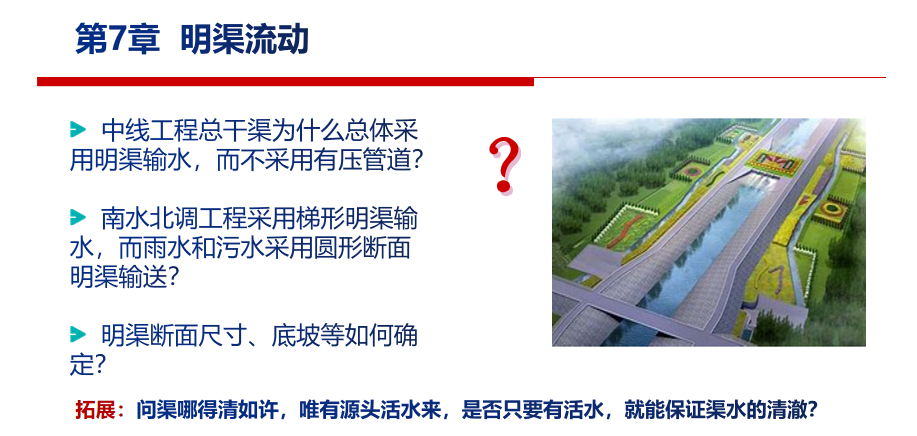 刘教授提前15分钟到达授课教室(核学楼507),学生们都前排入坐。本次课主讲的内容是明渠流动,刘教授授课以南水北调工程案例为载体,采用问题导学,将明渠流的特点、明渠水力最优断面、明渠均匀流的形成条件与特征以及明渠水力计算的基本问题等相关内容优化整合至工程问题中(南水北调中线工程干渠为什么采用明渠输水,而不采用有压管道?南水北调的明渠断面为什么采用梯形,而污水明渠断面采用圆形?如何设计渠道的断面尺寸?),授课内容有机融入案例问题,学生兴趣浓厚,课堂活跃,效果良好。