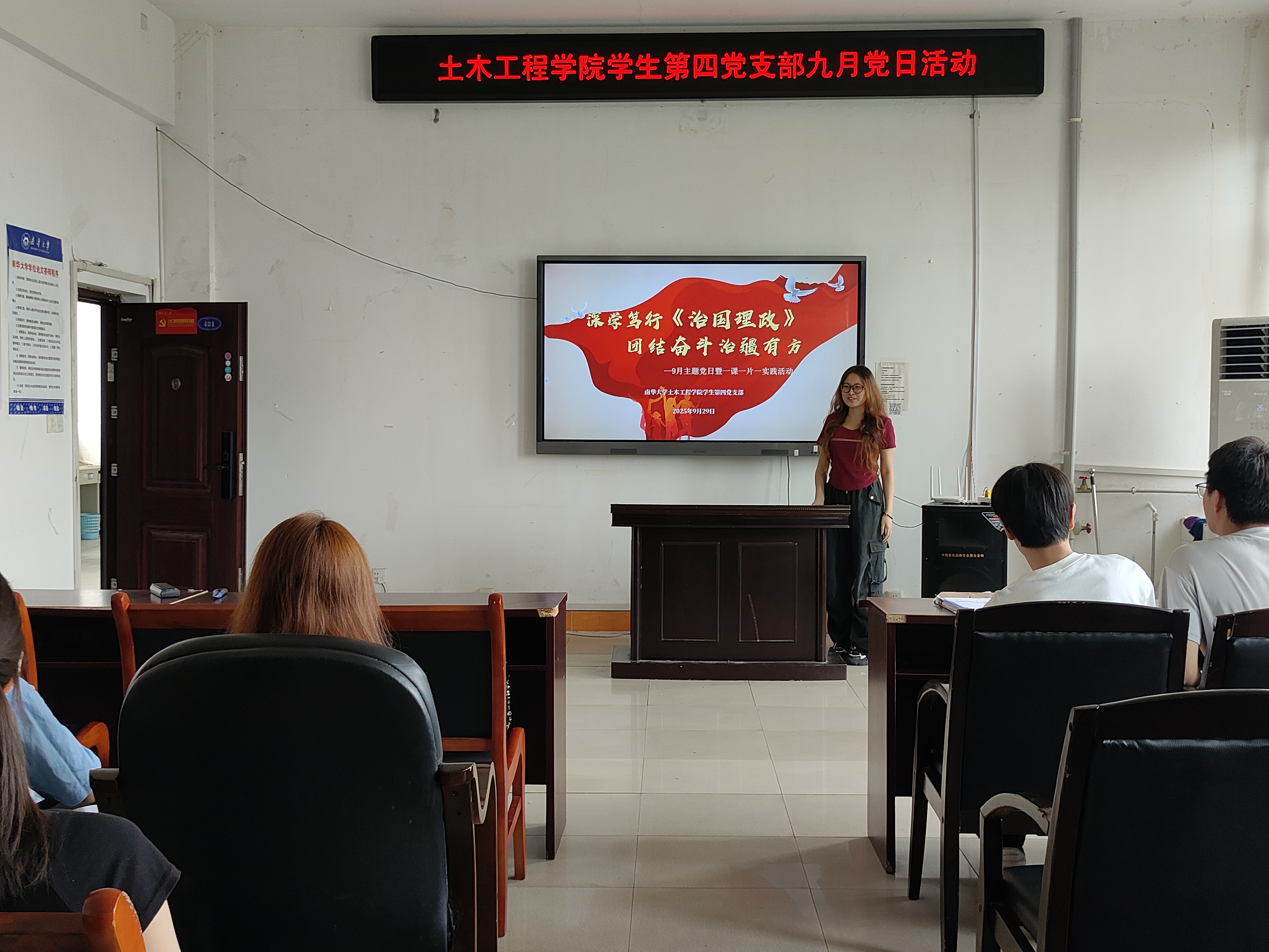 2025年9月29日10:30,英国365集团学生第四党支部在土木楼四楼会议室召开“深学笃行,团结奋斗”九月份主题教育党日活动。活动由谭思思同志主持,全体支部成员参加。