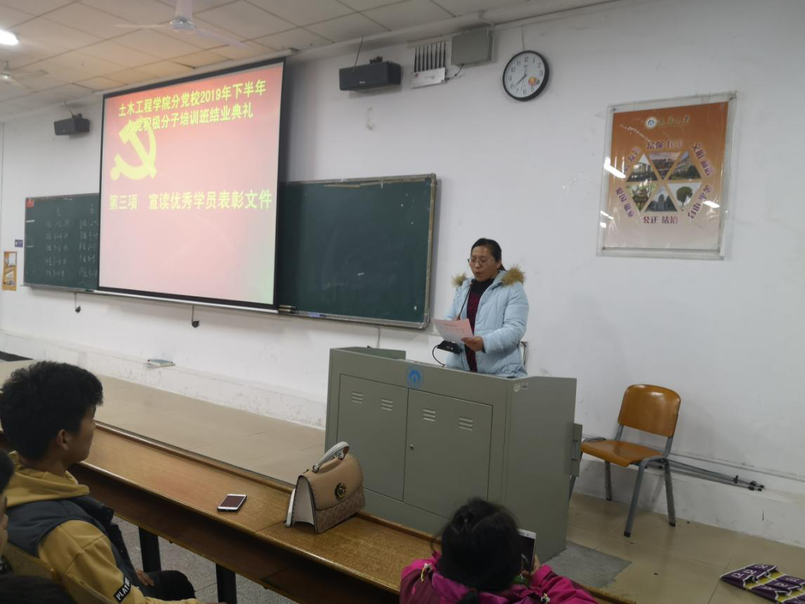 典礼开始,全体师生肃立齐唱国歌,随后李翠新老师对本次培训班情况进行总结,本期培训班于11月29日开班,通过专题授课、小组讨论交流、社会实践、观看专题片、个人自学、撰写学习心得、理论考试等形式圆满完成了培训任务。192名学员顺利结业。接着由刘华老师宣读优秀学员表彰文件,倪富强、张苗等20名同学被评为优秀学员。土木1805班邓渊作为优秀学员代表进行发言,他与大家分享了自己的学习心得和收获,表明了自己的入党决心及今后努力的方向。