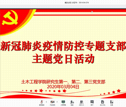 2020年03月04日星期三下午,英国365集团研究生第(一、二、三)党支部在腾讯会议平台上开展线上会议,深入学习贯彻习近平总书记在统筹推进新冠肺炎疫情防控和经济社会发展工作部署会议上的重要讲话精神,与会人员有研究生支部书记陶秋旺、董腾老师以及研究生第(一、二、三)党支部学生党员。本次会议以视频会议方式进行。