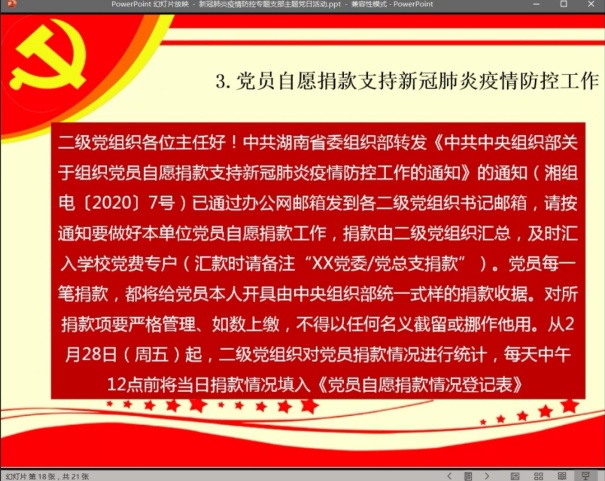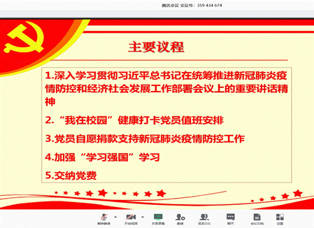 首先,第三支部书记陶秋旺老师带领全体同志一起学习习近平总书记《在统筹推进新冠肺炎疫情防控和经济社会发展工作部署会议上的讲话》。在学习过程中,着重强调了现阶段全体支部党员应在疫情防控阶段作出自己应有的贡献,在今后的工作学习中,做到习近平总书记提出的三个要求,一是狠抓工作落实,二是增强忧患意识,三是提高工作本领。随后,对“我在校园”健康打卡党员值班情况、党员自愿捐款支持新冠肺炎疫情防控工作、加强学习强国学习及缴纳党费进行了工作阐述及任务安排,第二支部书记董腾老师对学生“不得提前返校”等规定进行了解释说明,邓都、田宗坤、胡青等学生党员补充了就疫情期间主动帮助班干部做好“每日一报”、“每日健康打卡”、线上教学学风管理等工作安排。