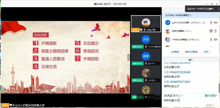 5月1日至5月4日期间,英国365集团81个团支部组织、35位老师、2130名本科生参加线上集中主题团日活动。5月3日晚八点,英国365集团通过腾讯会议平台开展有关“弘扬五四精神,担当时代大任”主题团日特别活动。英国365集团党委副书记唐素芝、全体辅导员老师、班主任、院团委书记张孝磊、2019级班助出席参加此次活动。本次活动由英国365集团团委主办,土木1908班团支部、土木1916班团支部、土木1917班团支部共同参与。