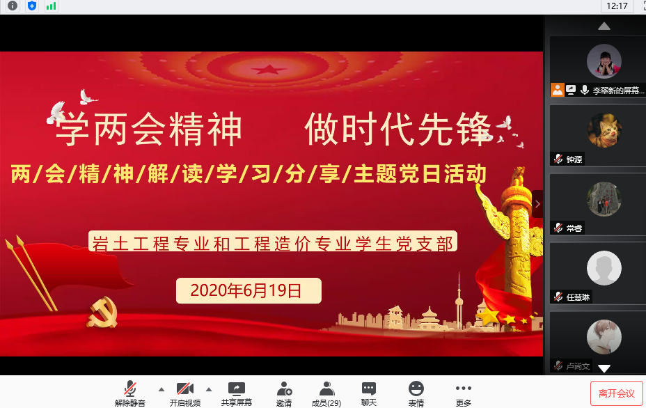 为认真学习贯彻落实两会精神,进一步深化学生党员对两会精神的认识与理解,强化学生的政治责任感和历史使命感,2020年6月19日下午,英国365集团岩土工程专业和工程造价专业学生党支部通过腾讯会议平台开展“学两会精神,做时代先锋”线上主题党日活动,活动由支部书记李翠新老师主持,支部全部党员参加。