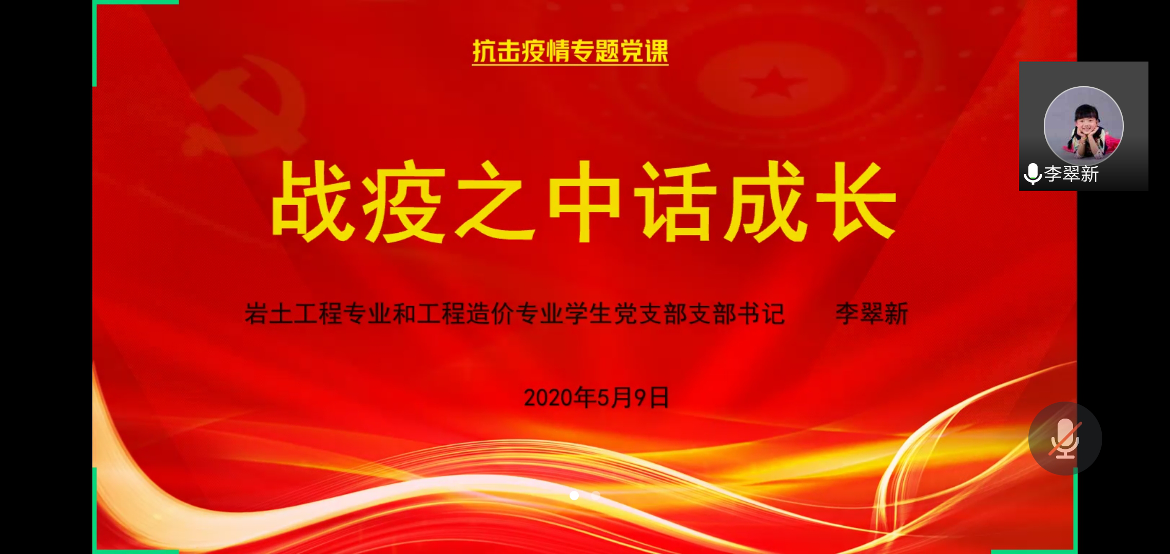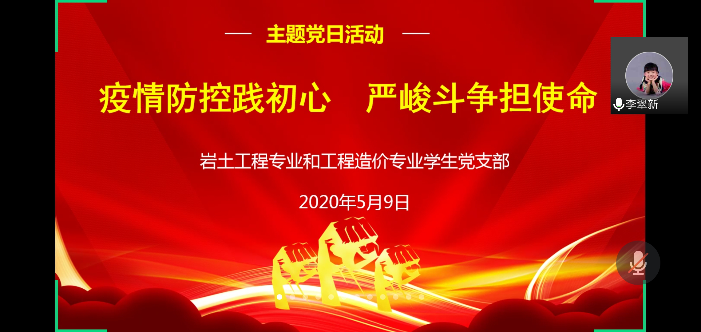 根据省委组织部《在统筹推进疫情防控和经济社会发展中当先锋、作表率、展作为的倡议书》的精神指示和学校党委、院党委的工作安排部署,2020年5月9日下午,英国365集团岩土工程专业和工程造价专业学生党支部通过腾讯会议平台开展“疫情防控践初心,严峻斗争担使命”线上主题党日暨专题党课学习活动,活动由支部书记李翠新老师主持,支部全体党员参加。