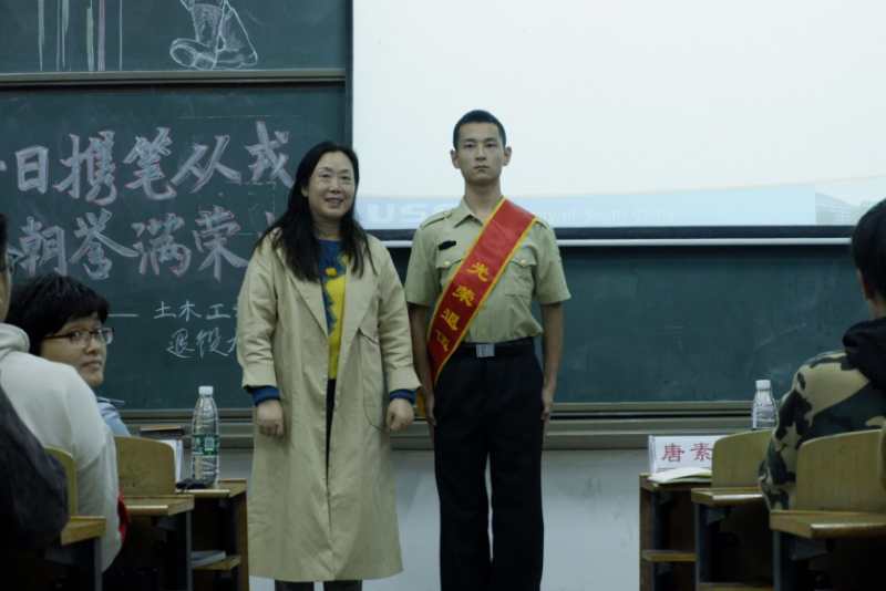 会议伊始,由两个“参军光荣”的视频正式拉开会议帷幕。紧接着,来自土木2005班的退役大学生姜泽文上台,唐素芝老师为他佩戴“光荣退伍”绶带。随后,姜泽文就两年的军旅生活分享了自己的经历与感受,他从迷茫到找到未来方向,从想过放弃到克服难关!发言结束,姜泽文与在场同学热情交流,解答同学们的疑惑,同学们也对军旅生活多了一份感慨,会议的气氛也被推向高潮。最后唐素芝老师进行总结讲话,她高度赞扬了大学生服兵役的行为,并从经济上、政治上和能力素质上总结了大学生服兵役的好处;她还谈到如姜泽文这样的退役大学生能起表率作用,发扬拼搏精神,带动全体学生共同进步!