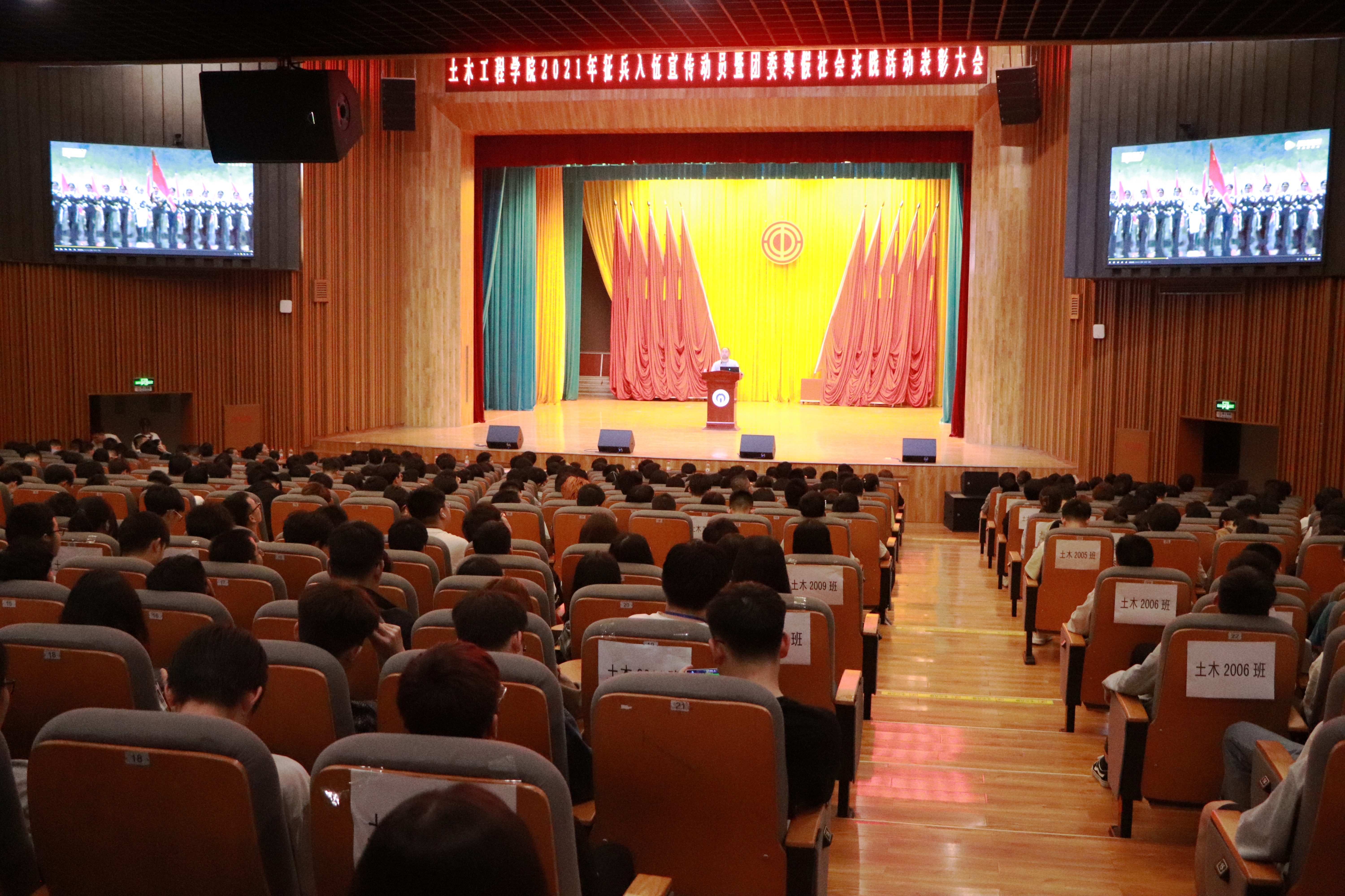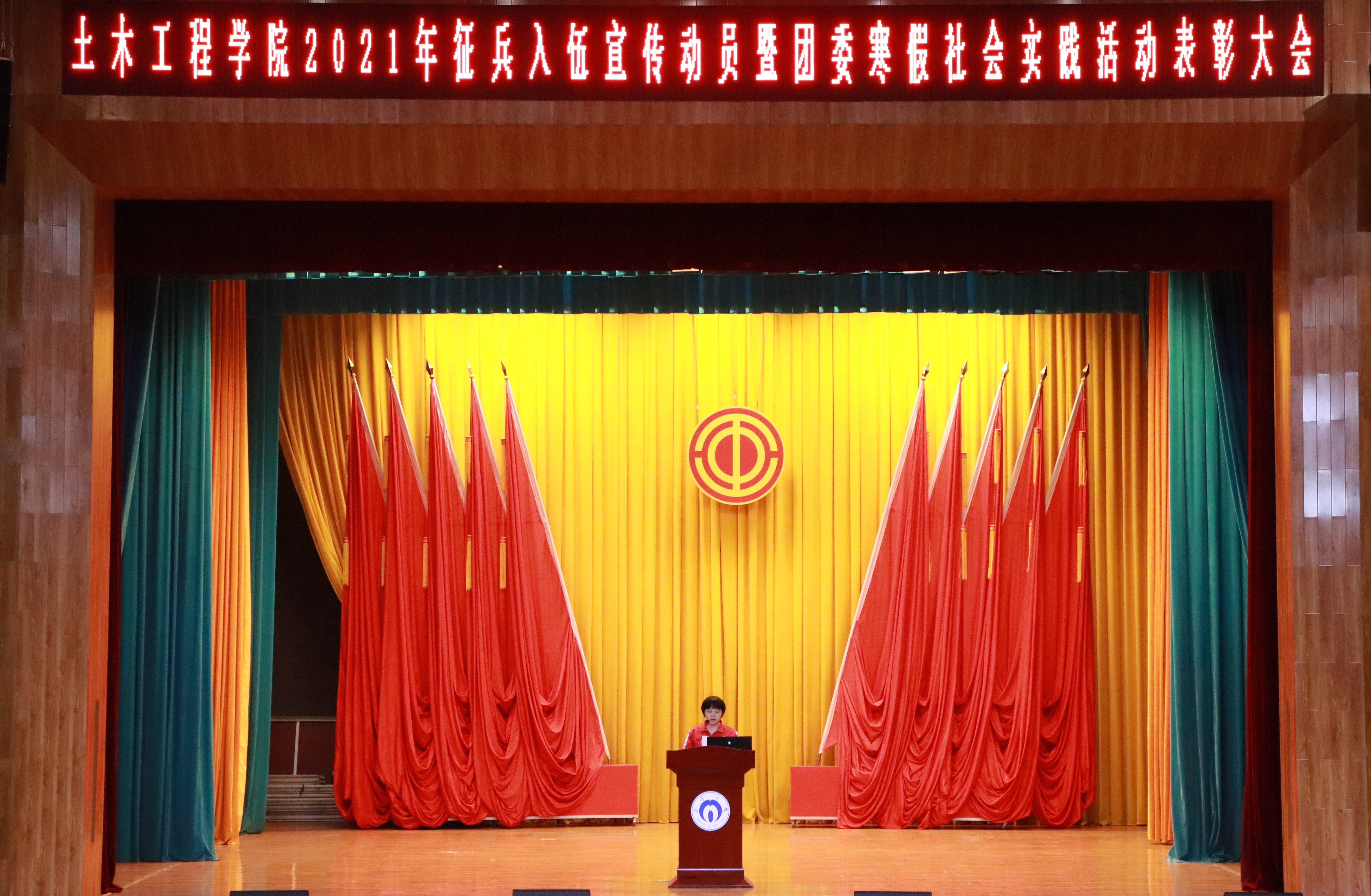 2021年4月23日晚19:00,英国365集团2021年征兵入伍宣传动员暨团委寒假社会实践活动表彰大会于南校大礼堂召开,英国365集团官网学工部军政训练与国防教育办公室老师汪先利,英国365集团院长谢东,学工室主任李翠新,辅导员老师贺淑珍、彭兴明、刘华、邓都及团委书记张孝磊共同出席本次活动。本次活动由张成隆同学主持。