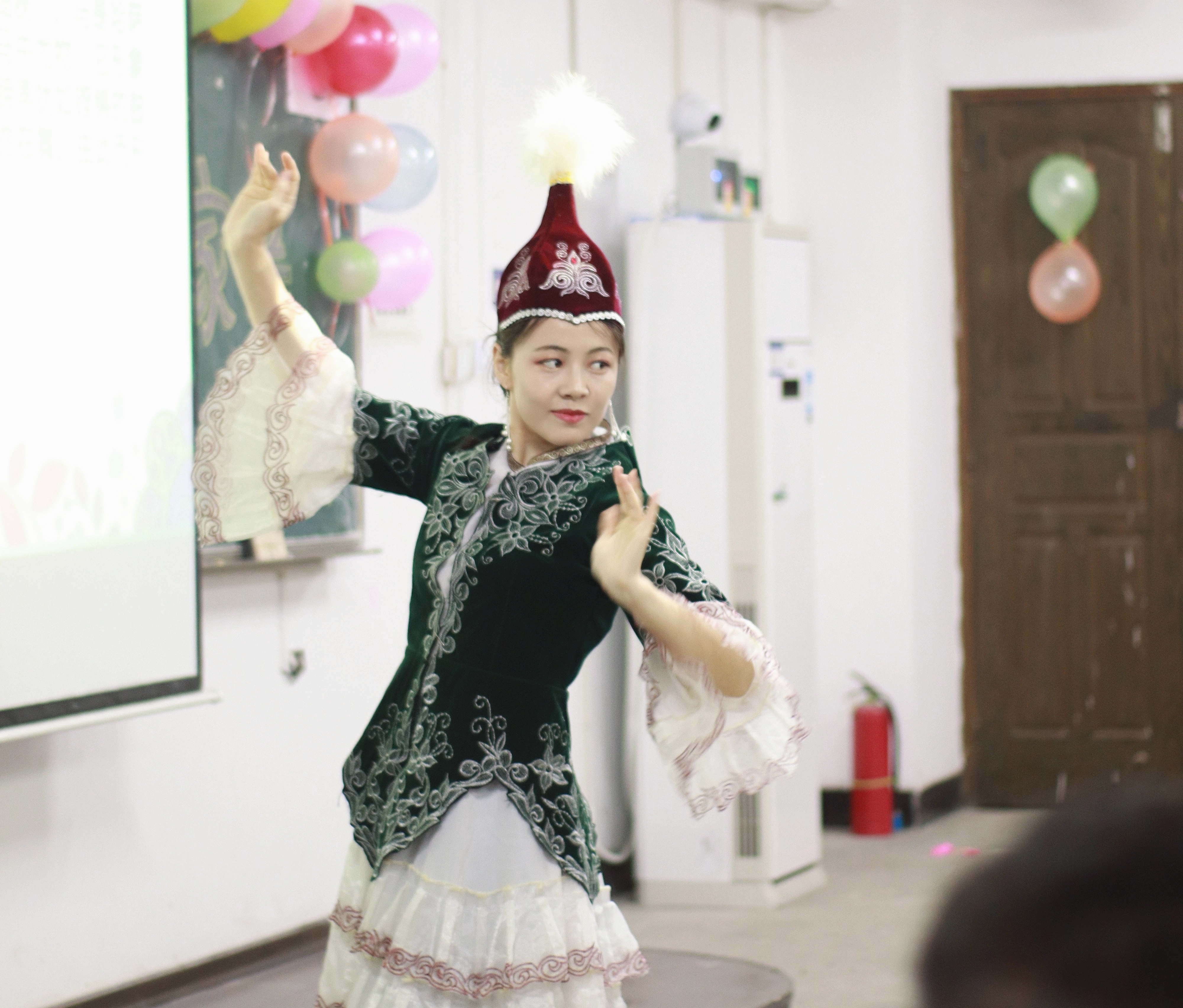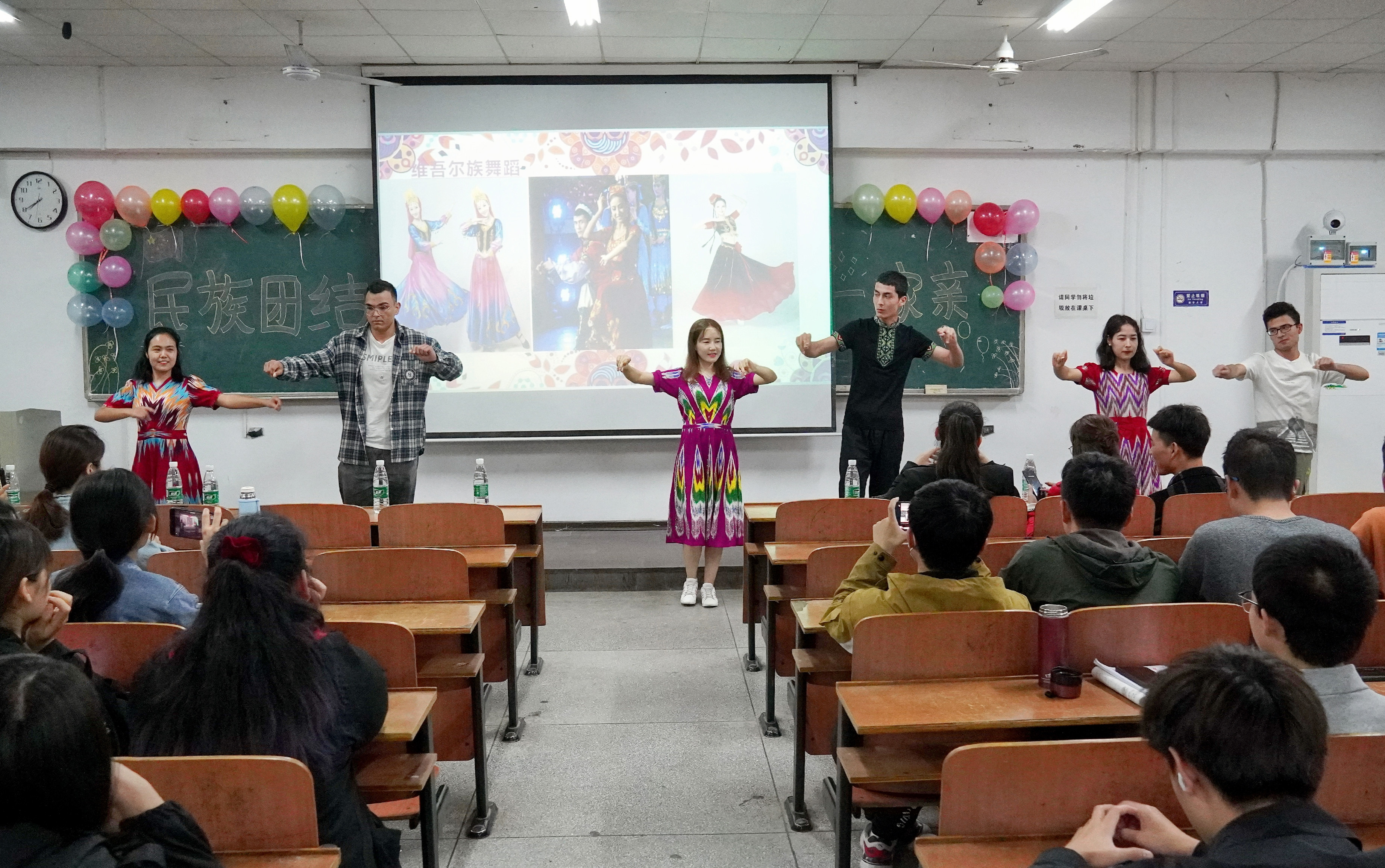 活动开始,同学们观看学习“习近平总书记在参加十三届全国人大第四次会议 内蒙古代表团审议时的讲话”。习近平总书记指出:“少数民族离不开汉族,汉族也离不开少数民族,各民族要像石榴籽一样紧紧抱在一起。”接着古力亚同学向同学们介绍了艾德莱斯丝绸的小知识、并与6名维吾尔族同学跳起了欢快的舞蹈,娜黑拉同学带来哈萨克族独舞《黑走马》。两位汉族同学带来汉服展示,并介绍了汉服的历史和分类。同学们通过服饰与舞蹈表现出了各民族对美好生活的期盼与热爱,使同学们感受到各民族文化的交融与碰撞。最后,同学们共同观看纪录片《中国历史之新疆印记》。主持人对片中的内容进行了提问,现场同学踊跃抢答,气氛热烈,体现了同学们对中华民族团结奋斗、繁荣发展的时代主题的认识。