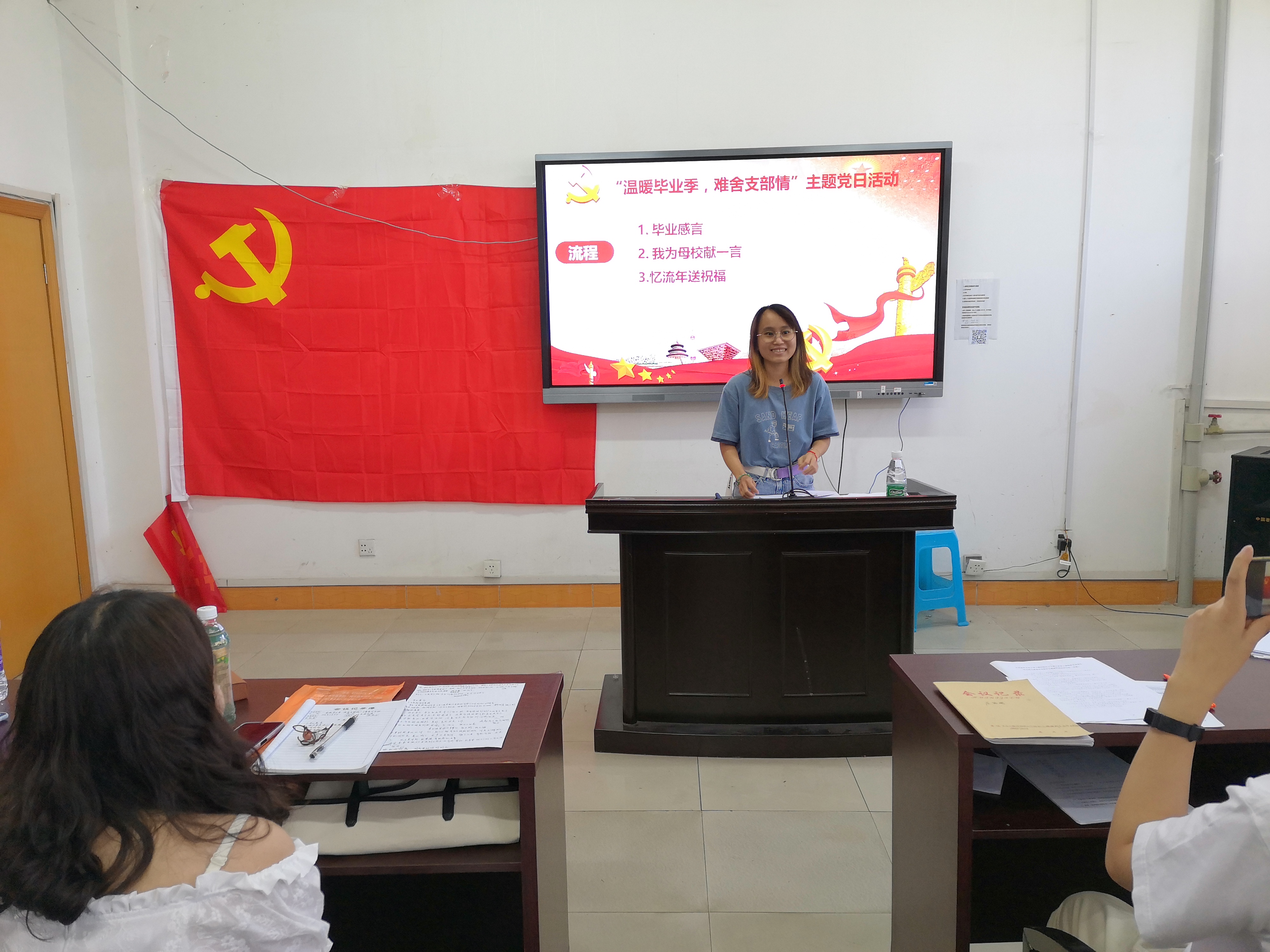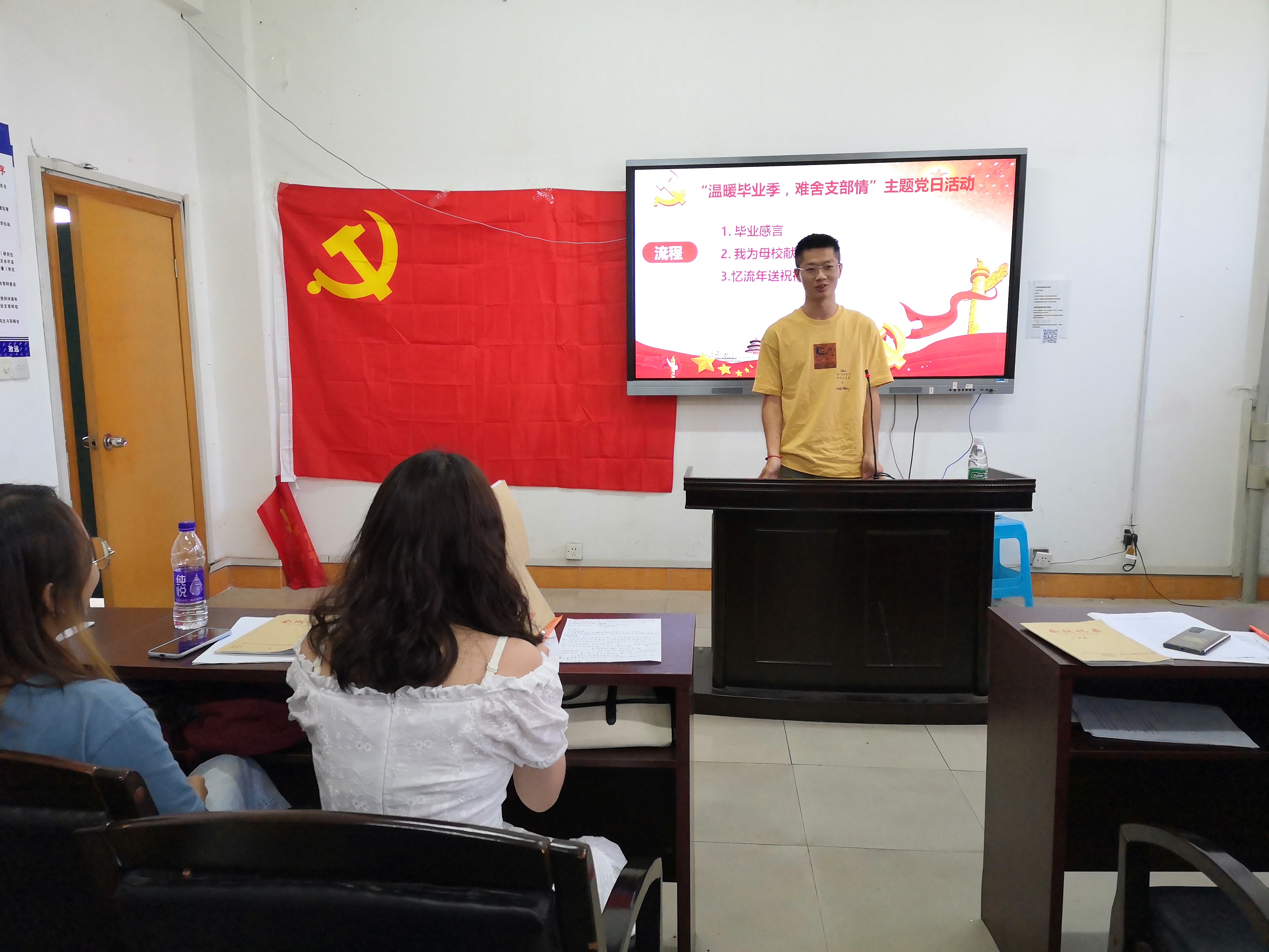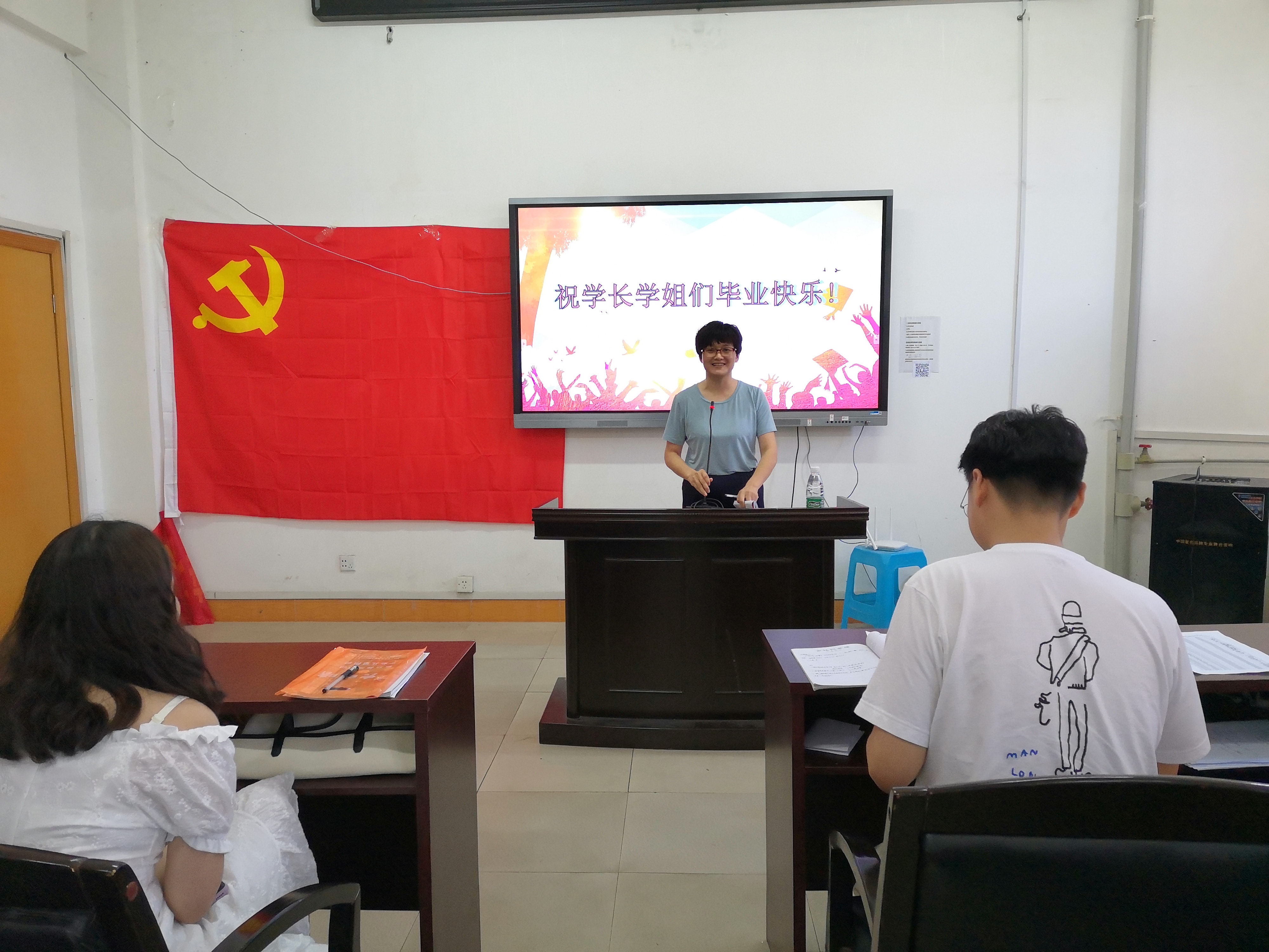 本次活动分三个环节:毕业感言、我为母校献一言、忆流年送祝福。屈海鹏、刘璐瑶、谭景鹏、黎艳红等同志为在座的学弟学妹们分享自己大学四年来的心得体会,结合自身经历带来一些建议和意见,鼓励学弟学妹们坚持本心、带着自信心和上进心对待未来的学习和生活,去完成自己的目标和理想。同时也为母校、学院的发展提出了自己的意见和建议。在忆流年送祝福环节中,学弟学妹们为毕业生党员带来了合唱《再见》、朗诵《桅子花开的毕业季》,并赠送祝福卡,表达对学长学姐们毕业的真切祝福。