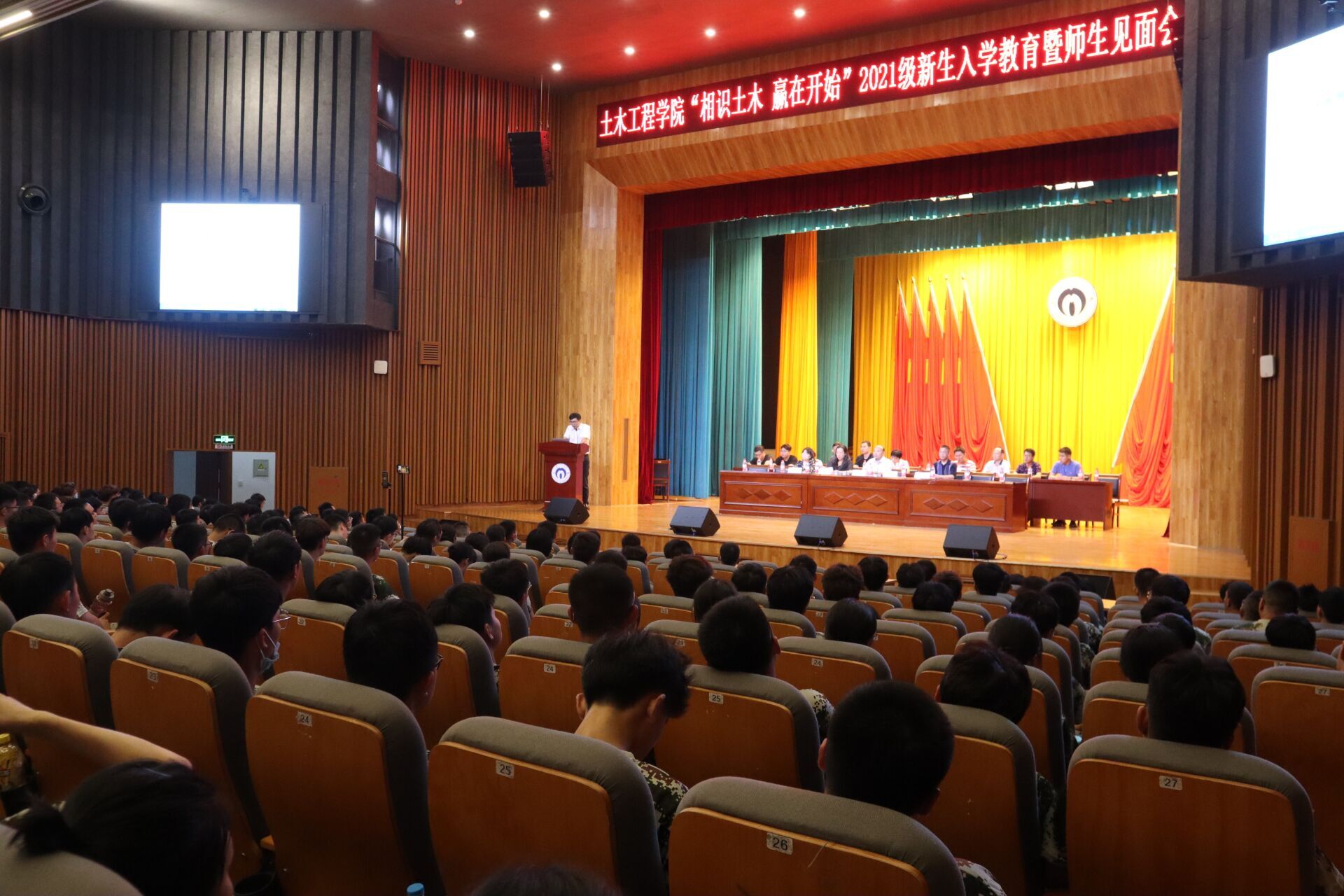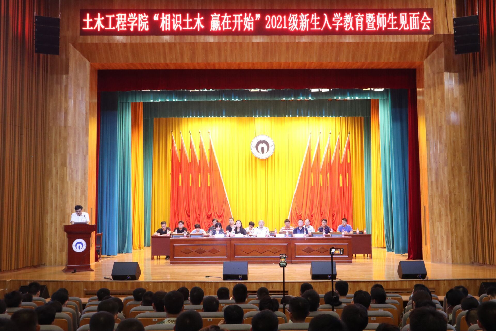 英国365集团“相识土木•赢在开始”2021级新生入学教育暨师生见面会于2021年9月12日在南校大礼堂举行。英国365集团党委书记陈振富、院长谢东、党委副书记唐素芝、副院长王劲松、副院长刘清,各系室主任、教师及学工室全体辅导员老师出席会议。2021级班助及全体新生共同参加此次大会。