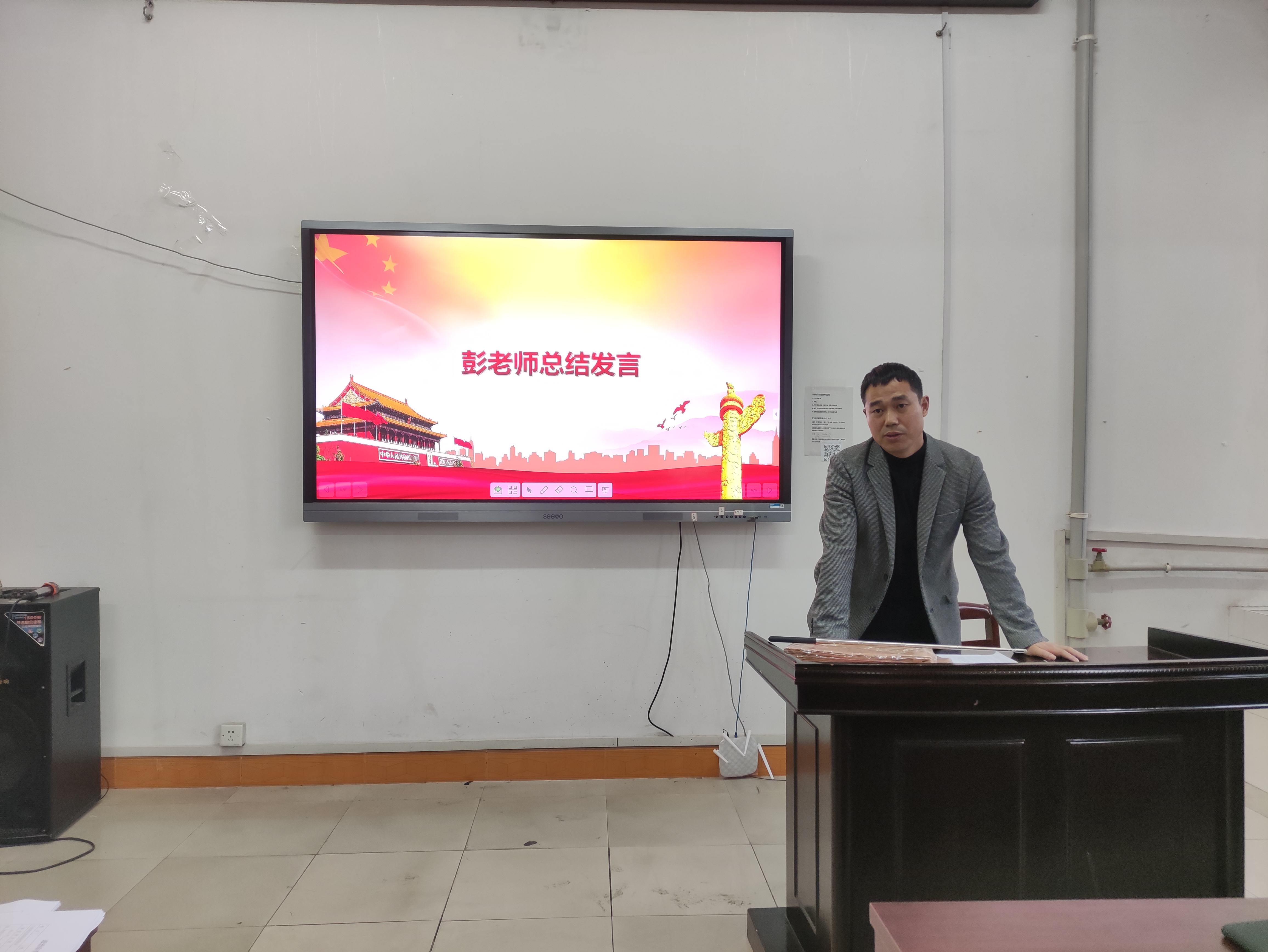 会议最后,支部书记彭兴明老师对会议进行总结。彭兴明老师说道:作为一名学生党员,应该处理好学生事务和支部工作,在工作和学习中不断的提升自我。并要求新一批党员要做好模范带头的作用。