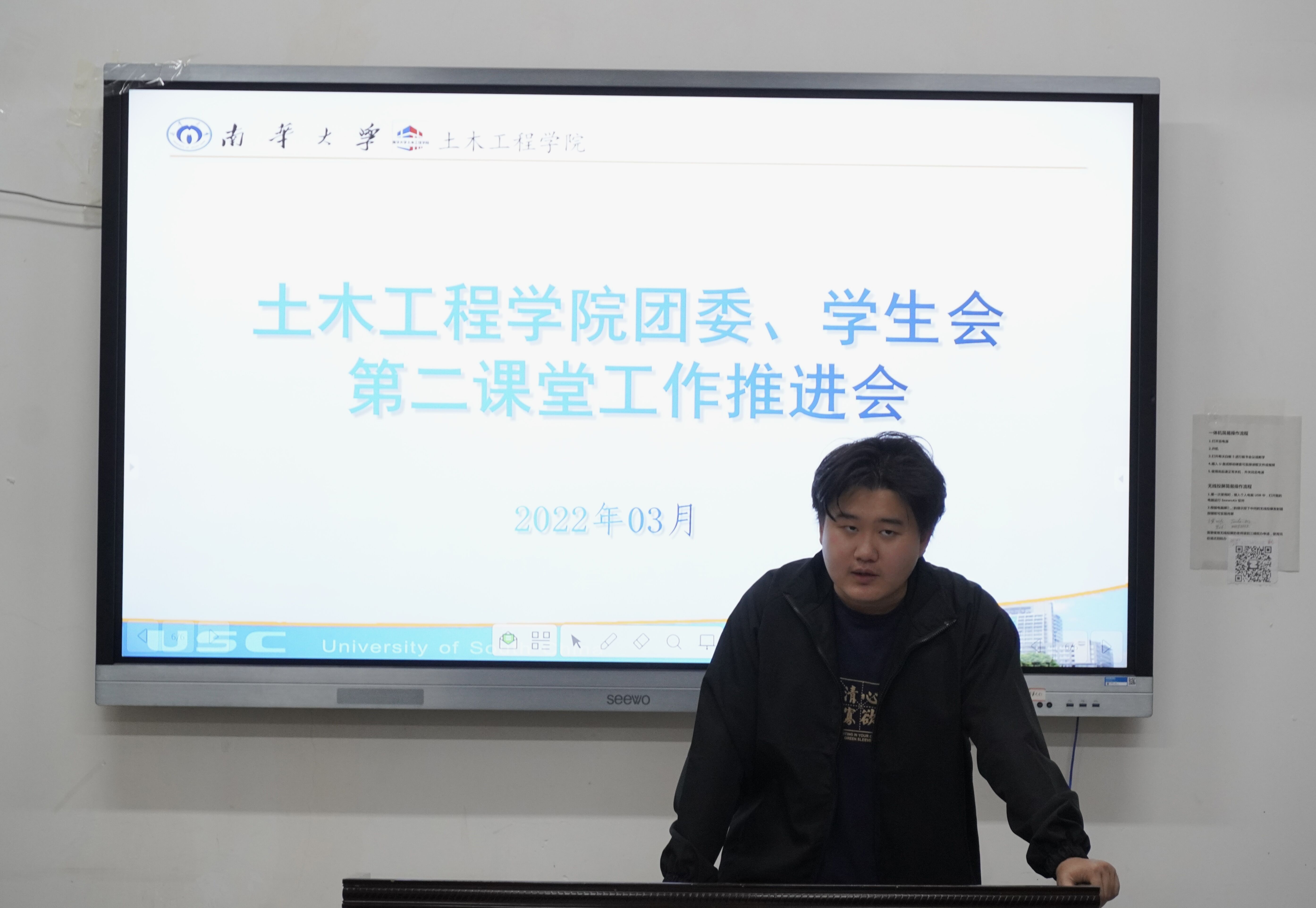 会议第二项,举行团委学生会第二课堂工作推进会。首先,学生会主席张钞指出学院两大工作任务并对各个部门近期二课工作提出具体要求。接着,张钞对我院第二课堂学分达标情况作简要说明并提出建议。为尽快完成毕业生二课未达标者数量清零这一目标,他从活动对接、学分帮扶及班委发动等方面提出具体措施。此外,为提高学院二课达标率,他就活动负责部门、活动分工及对接等问题给出建议和办法。最后,他针对到梦空间活动发布、管理及后续相关流程提出具体。至此,此次会议圆满结束。
