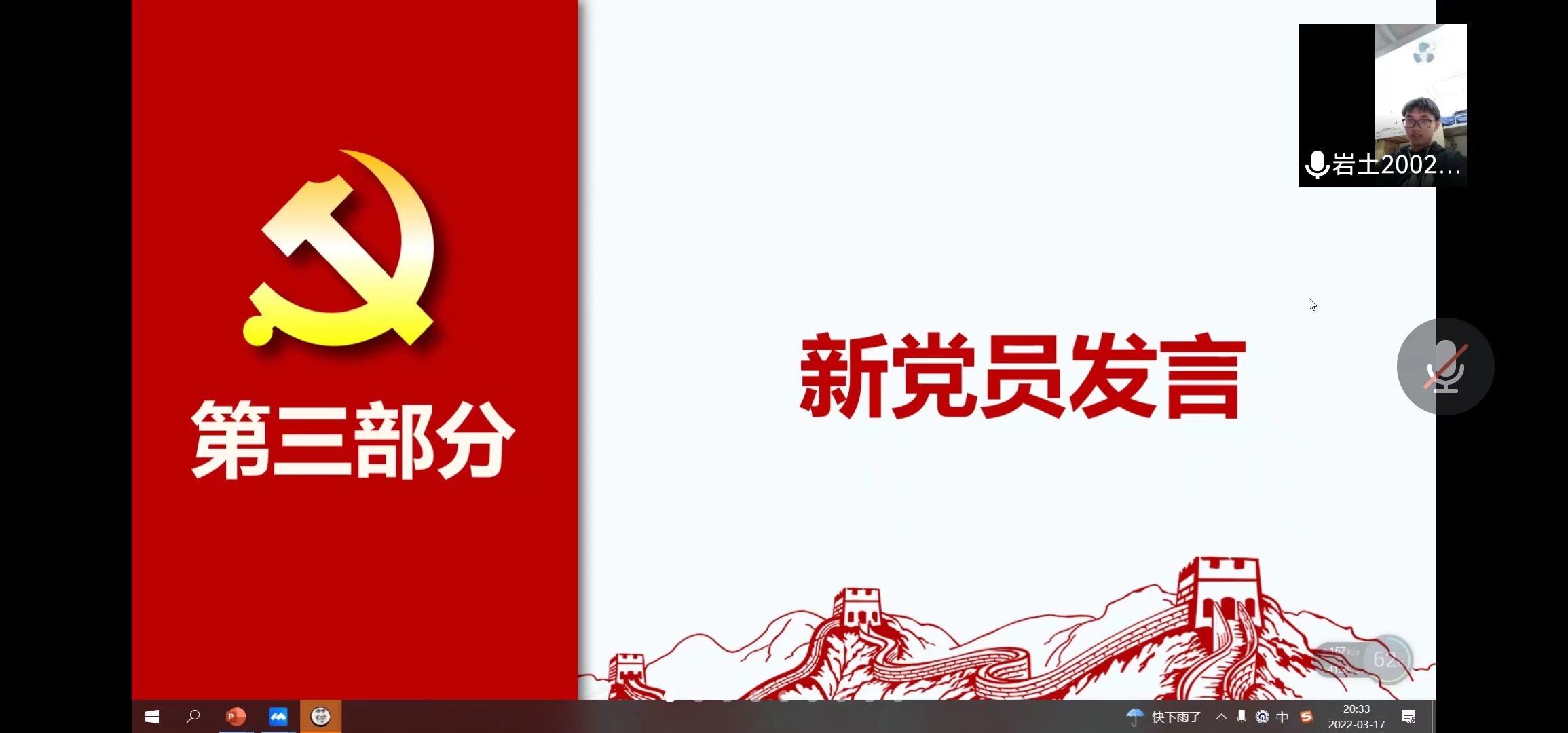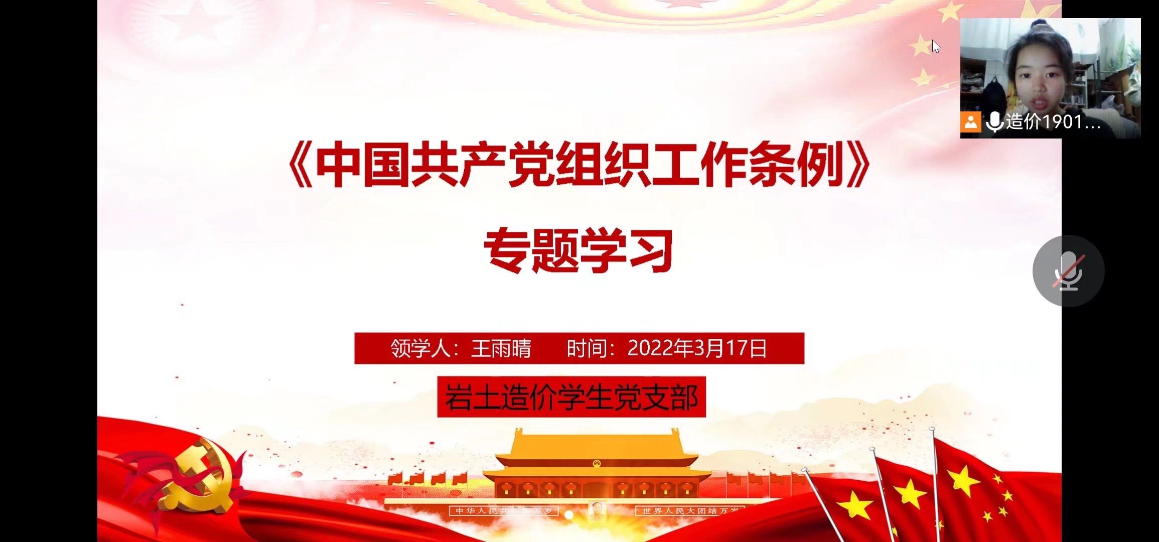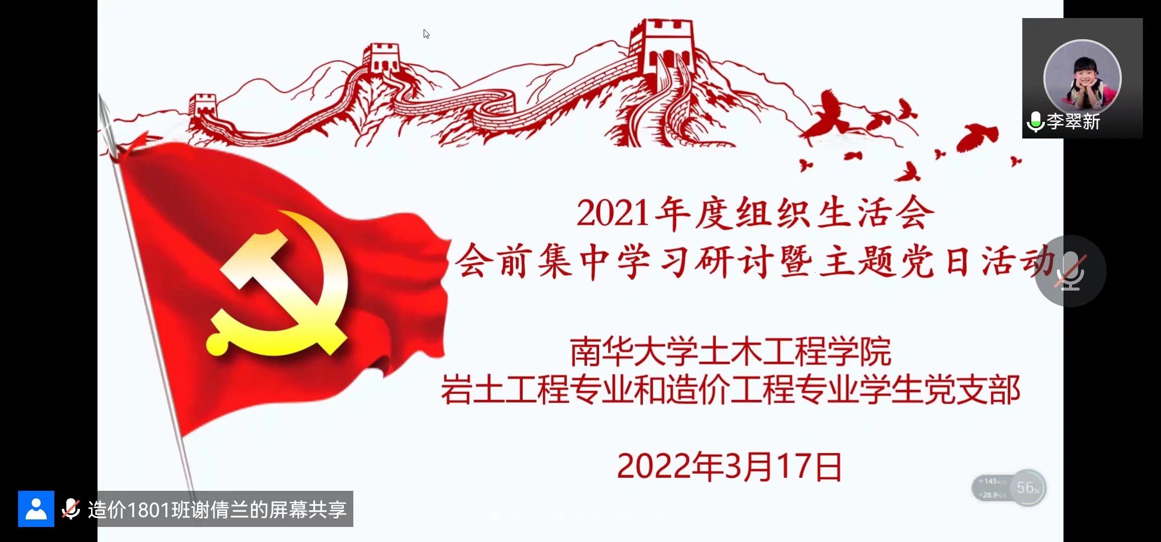 2022年3月17日19:30,英国365集团岩土工程专业和工程造价专业学生党支部通过线上方式开展2021年度组织生活会会前集中学习研讨暨主题党日活动,活动由支部副书记谢倩兰同志主持,支部书记李翠新老师和全体党员参加。