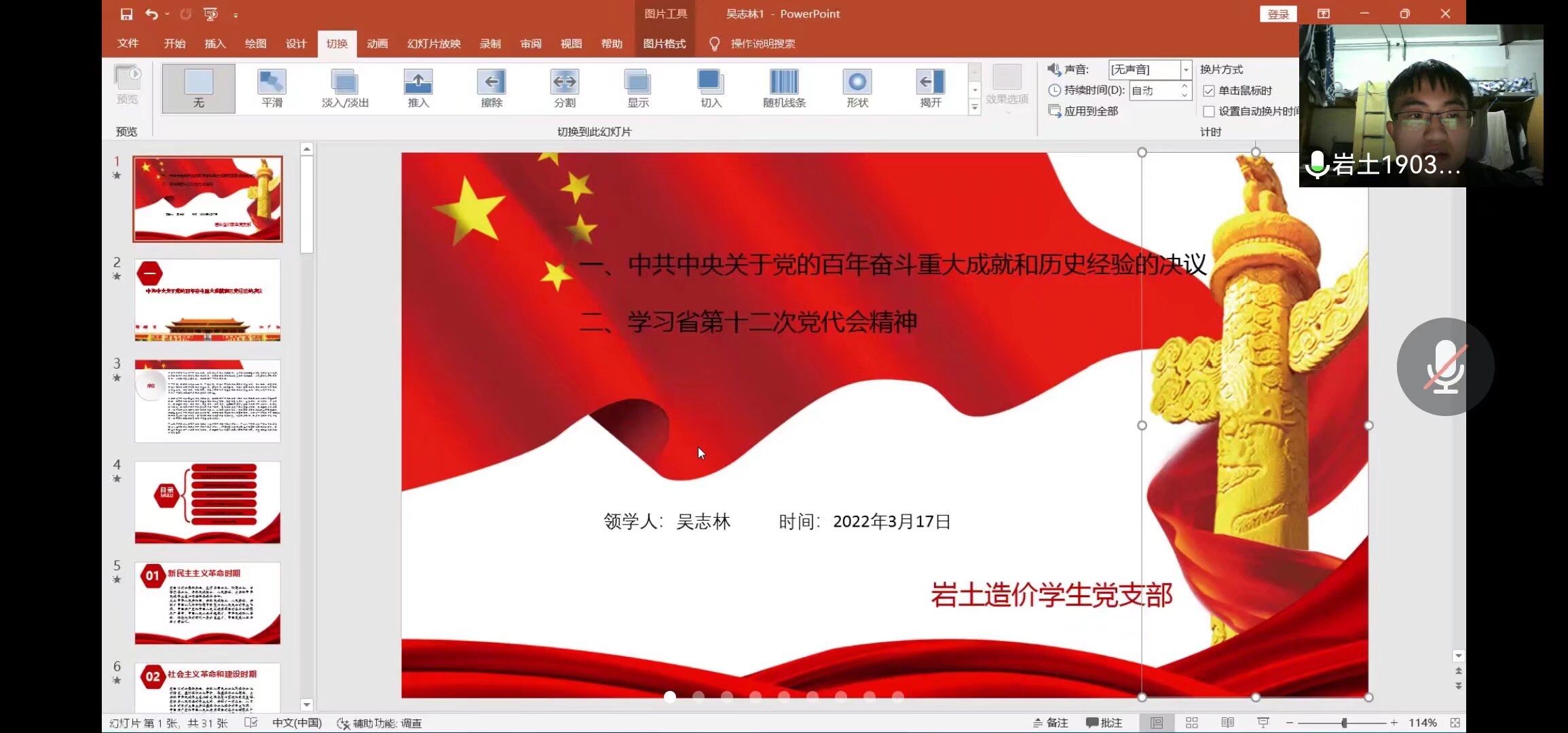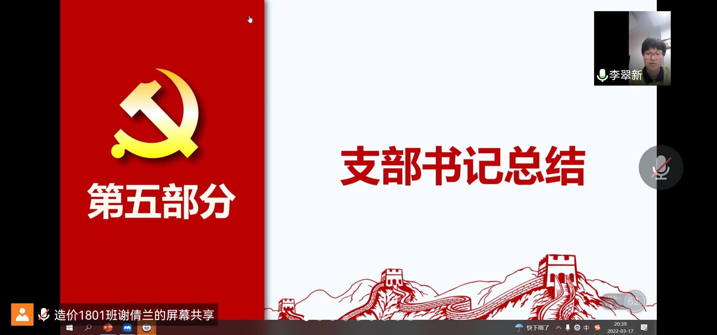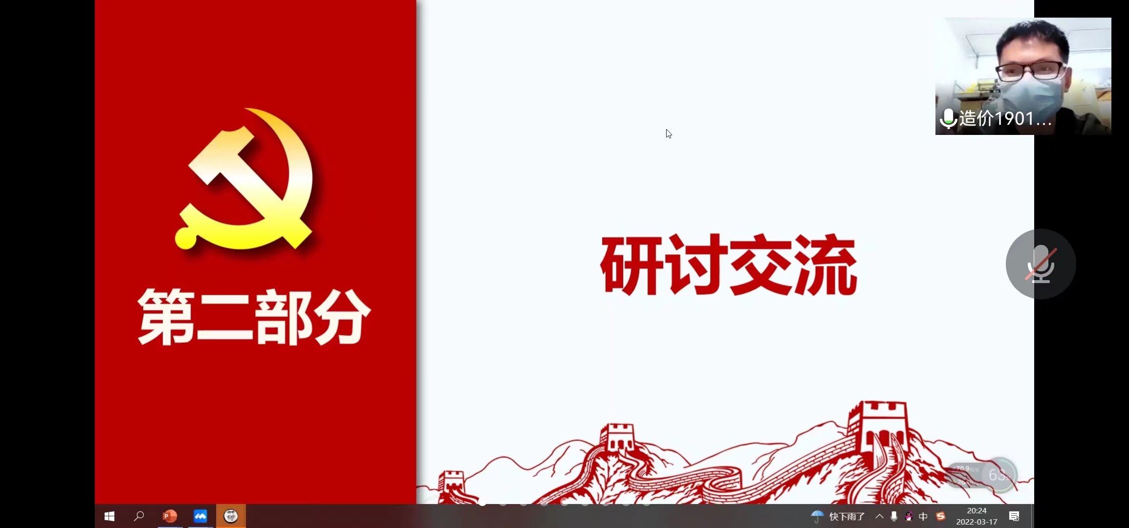 2022年3月17日19:30,英国365集团岩土工程专业和工程造价专业学生党支部通过线上方式开展2021年度组织生活会会前集中学习研讨暨主题党日活动,活动由支部副书记谢倩兰同志主持,支部书记李翠新老师和全体党员参加。