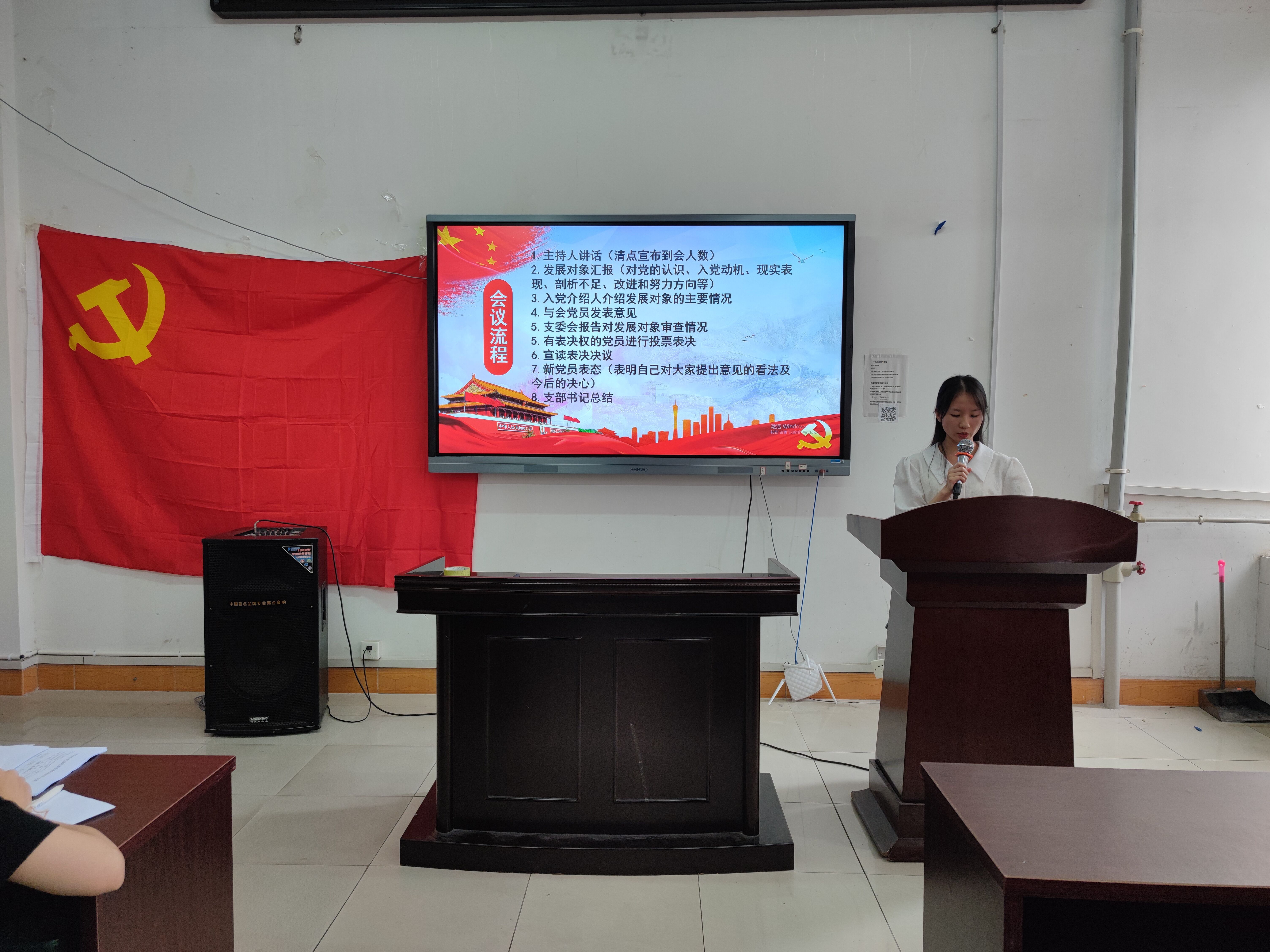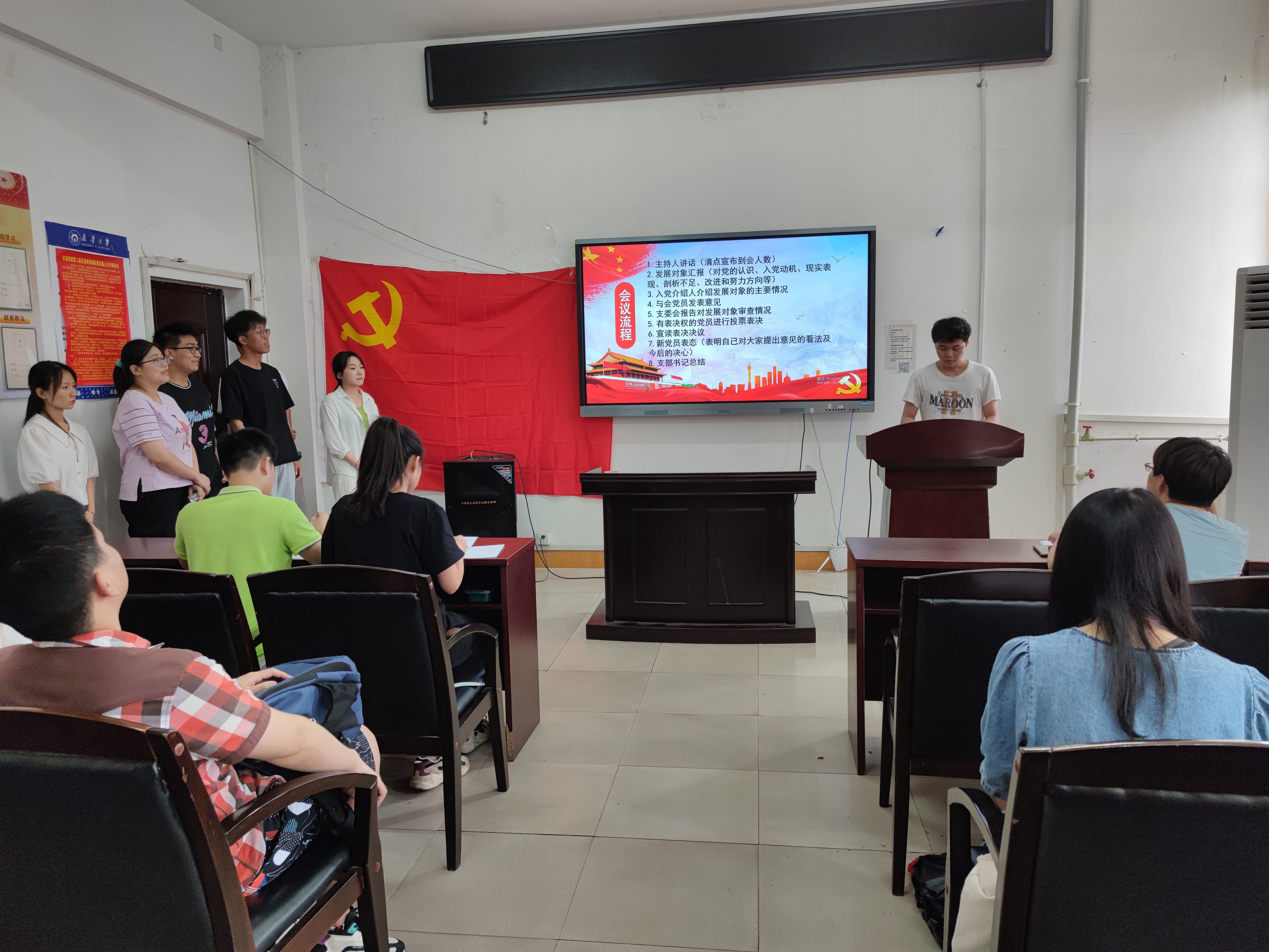 会议严格按程序进行,主持人清点宣布到会人数,对本次会议进行说明并介绍流程。罗世玉等7名发展对象逐一汇报自己对党的认识、入党动机、现实表现、剖析不足,并阐述了改进和努力的方向等情况。之后,入党介绍人说明了发展对象相关情况,对其能否吸收入党发表意见。谢倩兰同志向支部大会报告了罗世玉等7名同志的审查情况。与会党员积极酝酿讨论,充分发表意见。经无记名投票表决,一致同意吸收罗世玉等7名同志为中共预备党员。新党员纷纷表态,将改正缺点、不足,以坚持用合格党员的标准严格要求自己。
