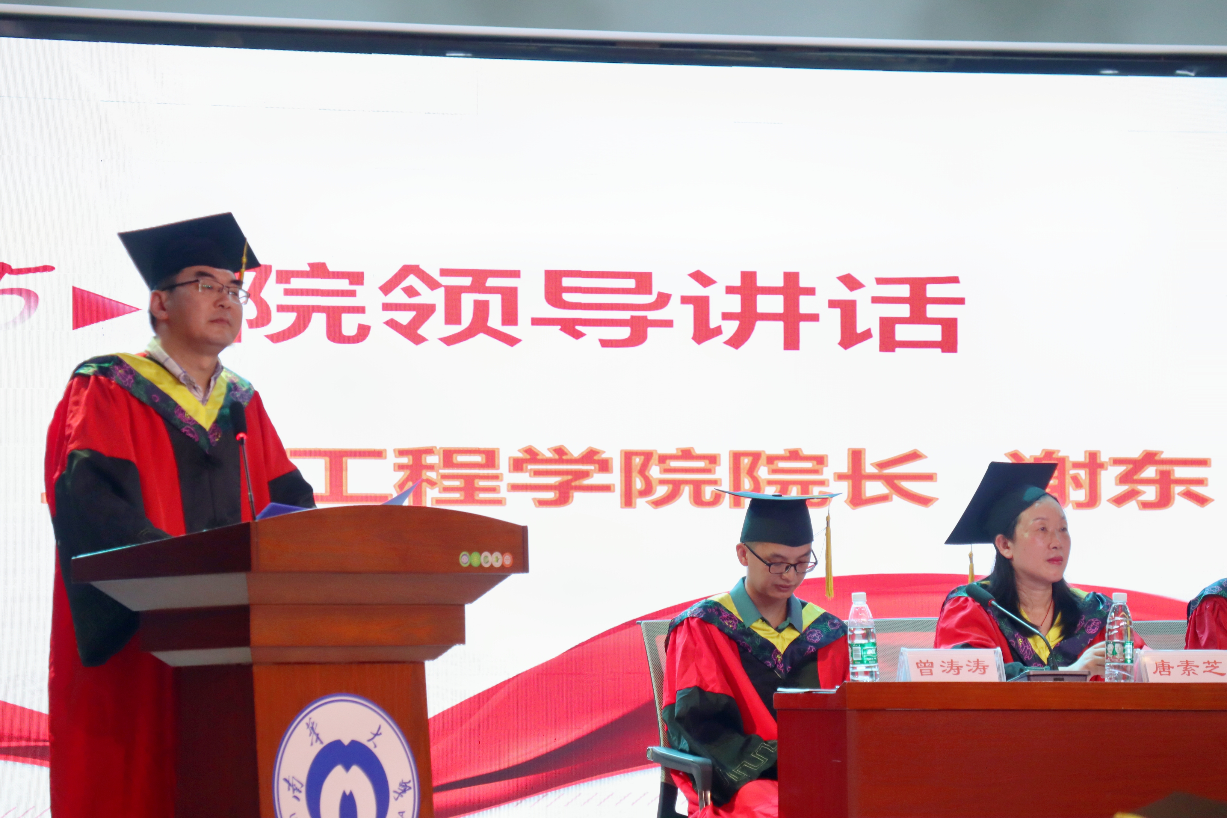 接着,谢东院长致辞。他向老师们和家长们表示感谢,向校友们表示敬意,向毕业生们致以美好的祝愿:“祝愿全体毕业生前进的步伐如摩天大楼的基础般稳健扎实,未来的道路如给排水一样通畅顺利,生活如建工建环营造的环境一样舒适健康,工作如建筑电气与智能化一样充满智慧和活力,事业如道路桥梁一样四通八达、纵横千里!”