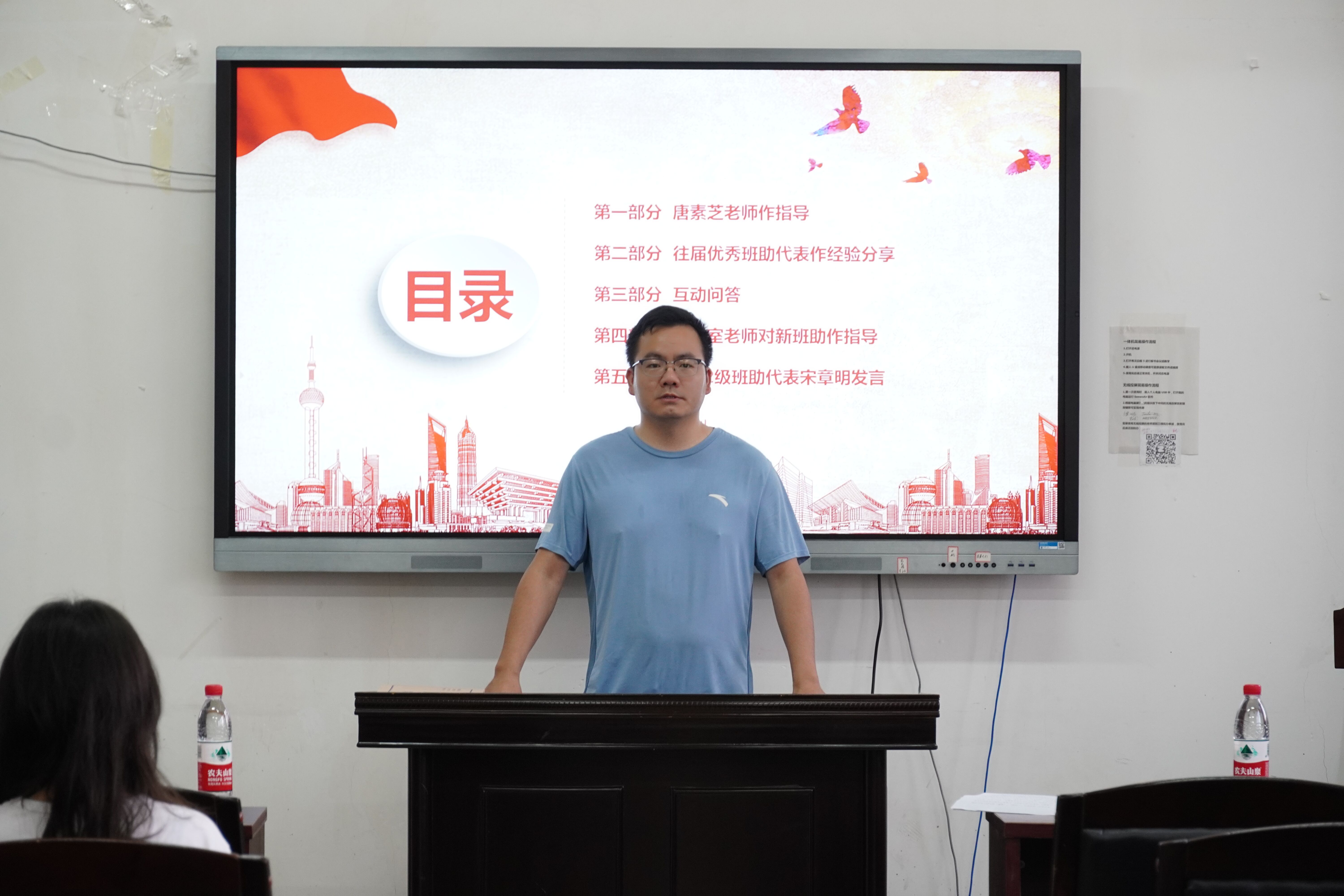 会议伊始,主持人介绍与会成员及会议议程。开场前,吴旦老师表示,各位新生班助应积极向往届优秀班助学习,以恒心守初心,发挥好师生间桥梁作用与榜样带头作用。随后,唐素芝老师从“为什么要做班助”和“怎么做好班助”两个方面作指导,帮助大家找好角色定位,叮嘱新生班助要时刻牢记作为班助的责任感、与班级荣辱与共的使命感和与同学共同成长的自豪感,并希望全体班助担好使命,为新生成长提供积极推动力。