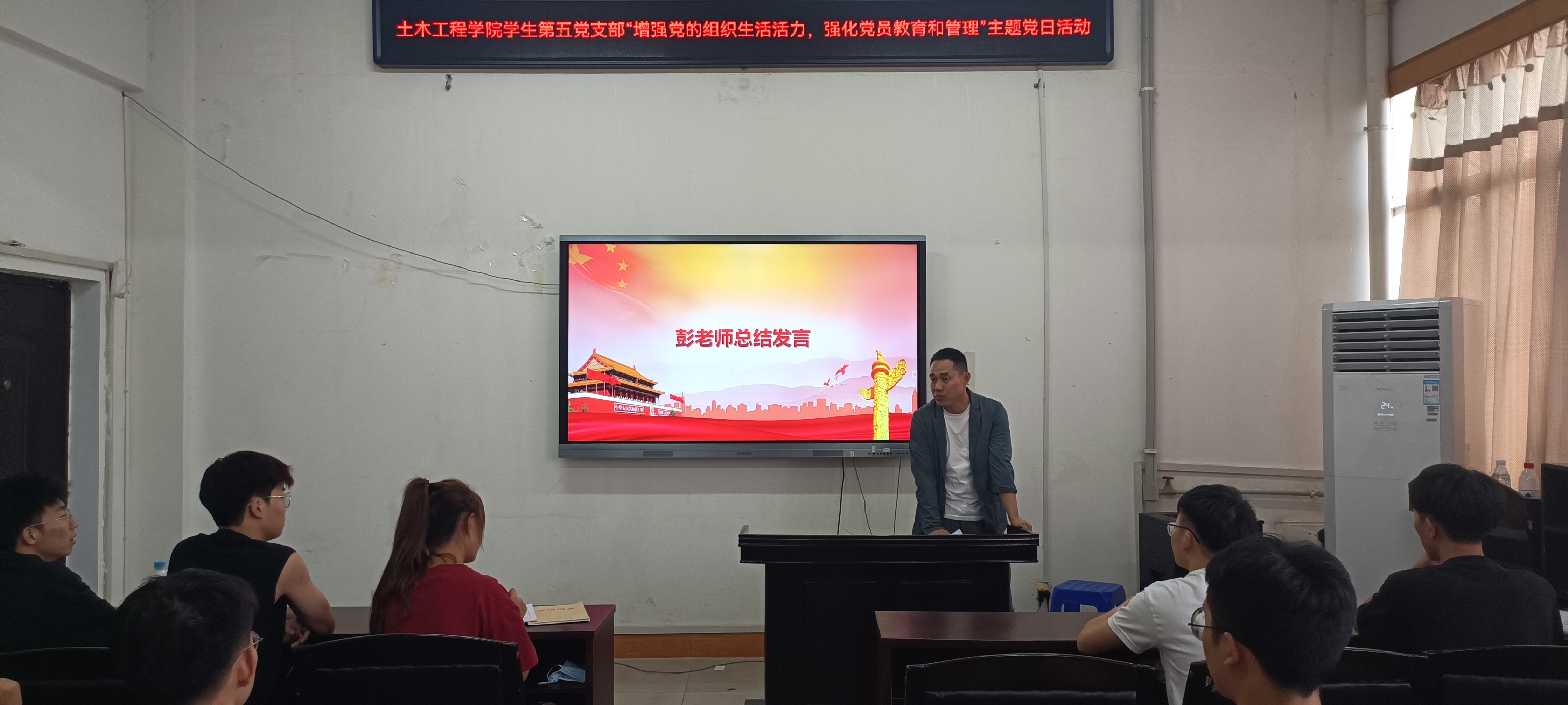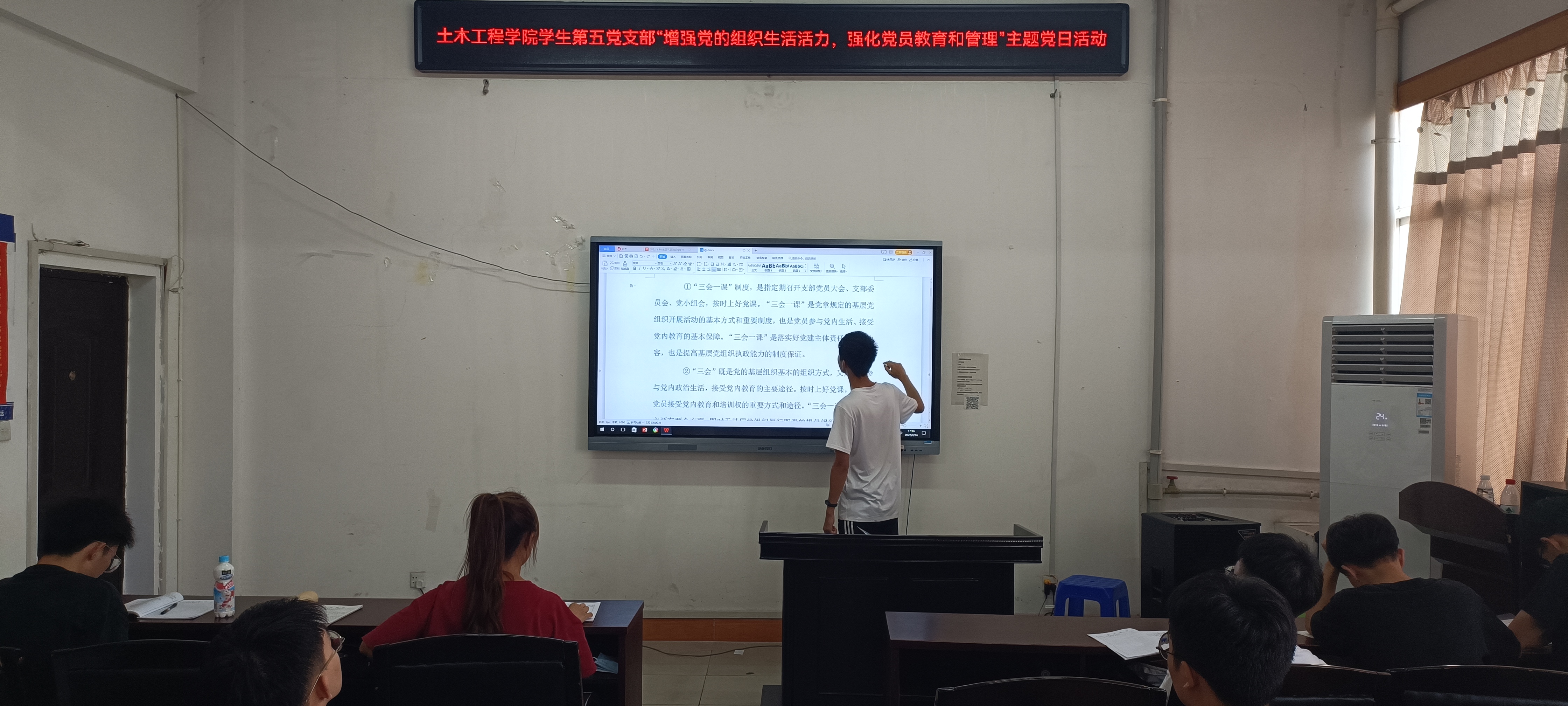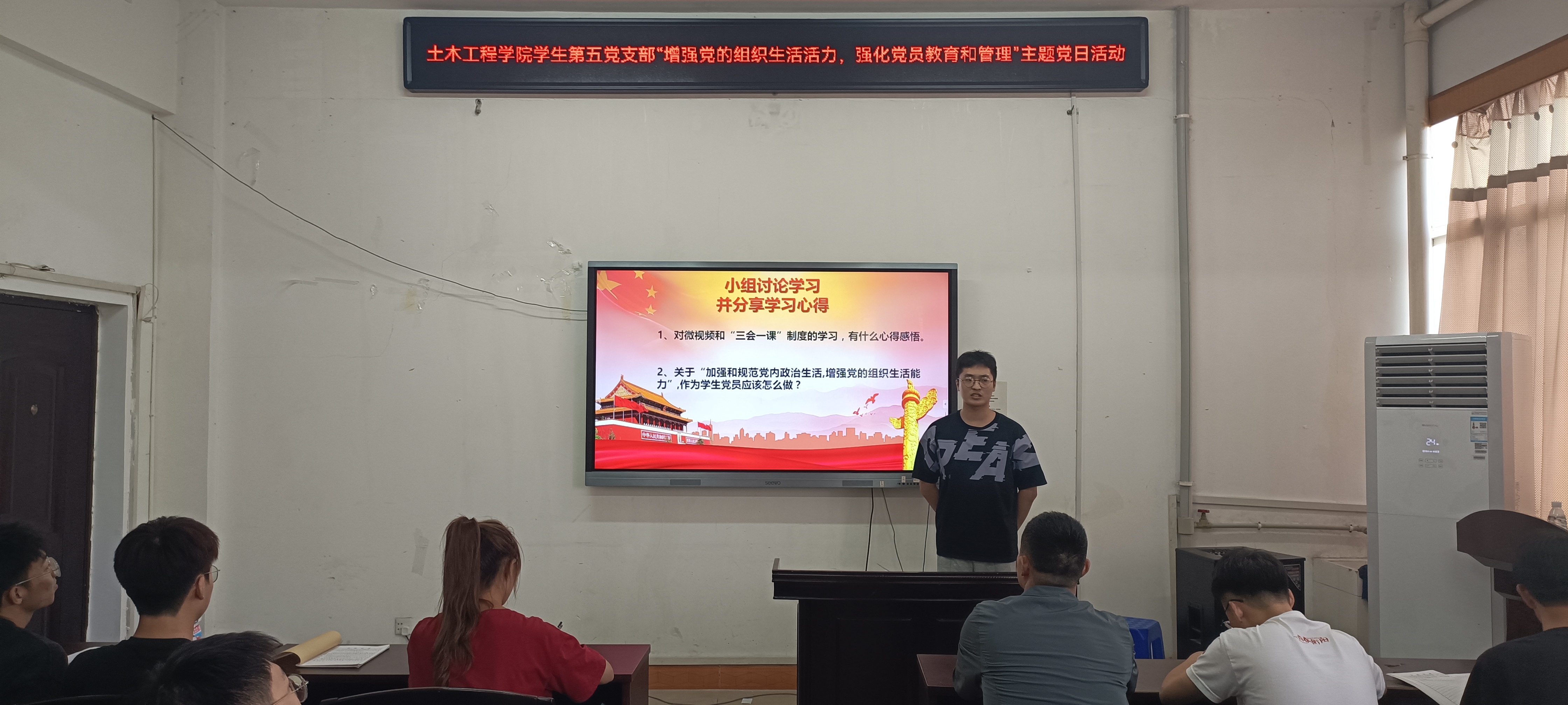 2022年9月16日17:00,英国365集团学生第五党支部于土木楼四楼会议室举行“加强和规范党内政治生活,增强党的组织生活活力,强化党员教育和管理”主题党日活动,会议由支部书记彭兴明老师主持,全体学生党员参加。