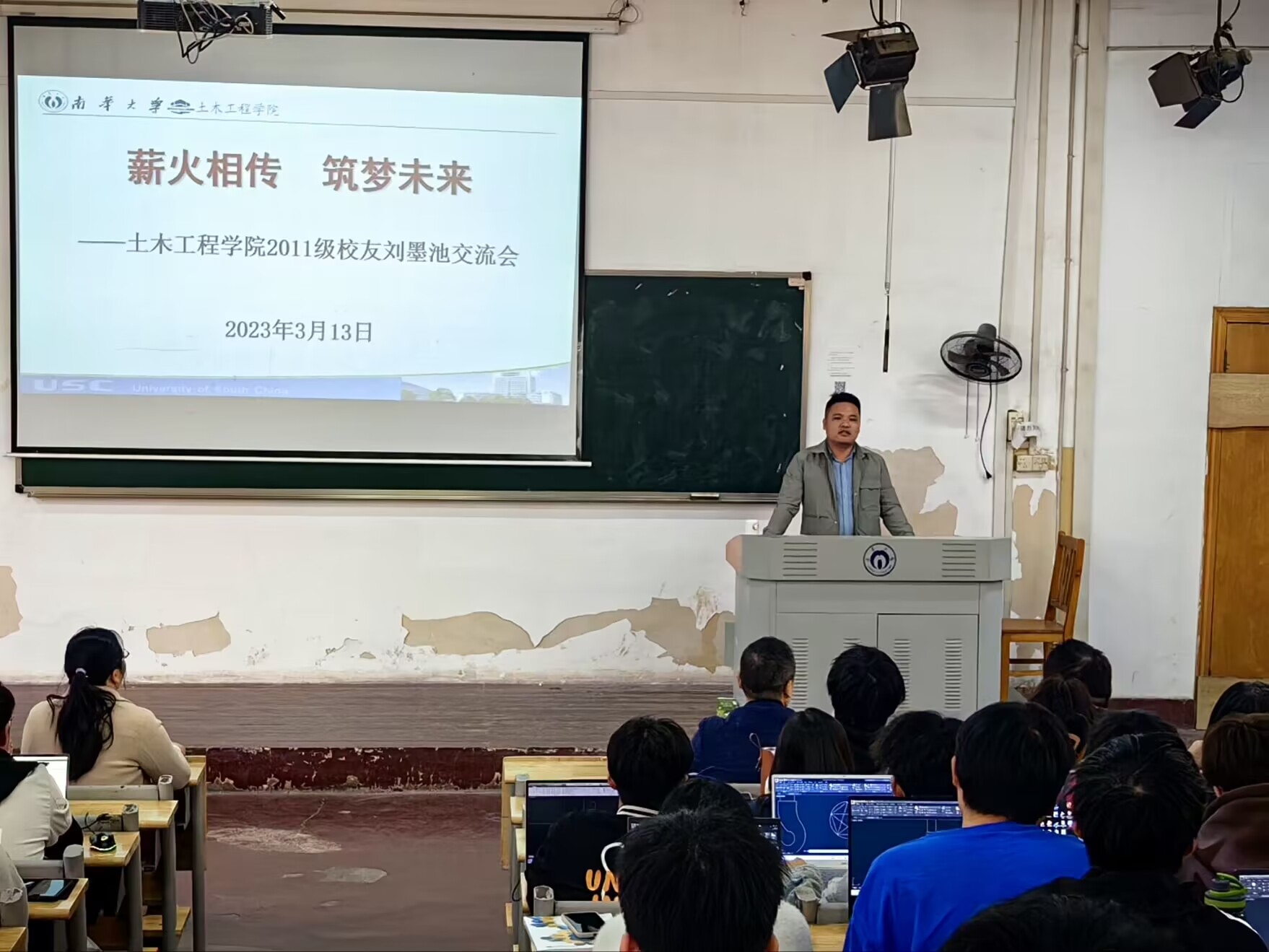 接着,校友刘墨池上台开展了一场生动的讲座。他先简单分享了公司概况及行业发展情况,然后结合自身就业心得与成长经历分享了宝贵的经验和独特的行业见解。接着他向学弟学妹们提出如下四点成长建议:第一,树立清醒的自我认知和职业发展计划,在校期间把握好每一次锻炼的机会,做任何事都要付出努力并有坚持不懈的精神;第二,企业追求的是人才,而人才追求的是平台,选好自己的就业背景,不把平台当本事,而是要珍惜平台,用好平台;第三,职业生涯是一场马拉松,要始终如一,不忘初心,砥砺前行,不论是考研还是就业,都不能三天打鱼两天晒网,半途而废;第四,要有奉献精神,从事土木行业有为国为民的热情,身为土木人,就应该有坚强不屈的精神和毅力,在坚持奋斗中不断提升,不断完善自我人格。然后他表达了对这一行业工作者建设祖国山河、对祖国的发展做出贡献的肯定与对同学们在未来美好发展的祝愿。