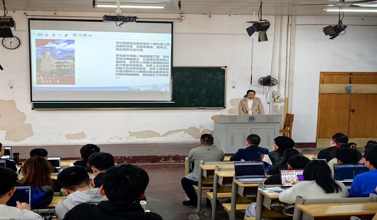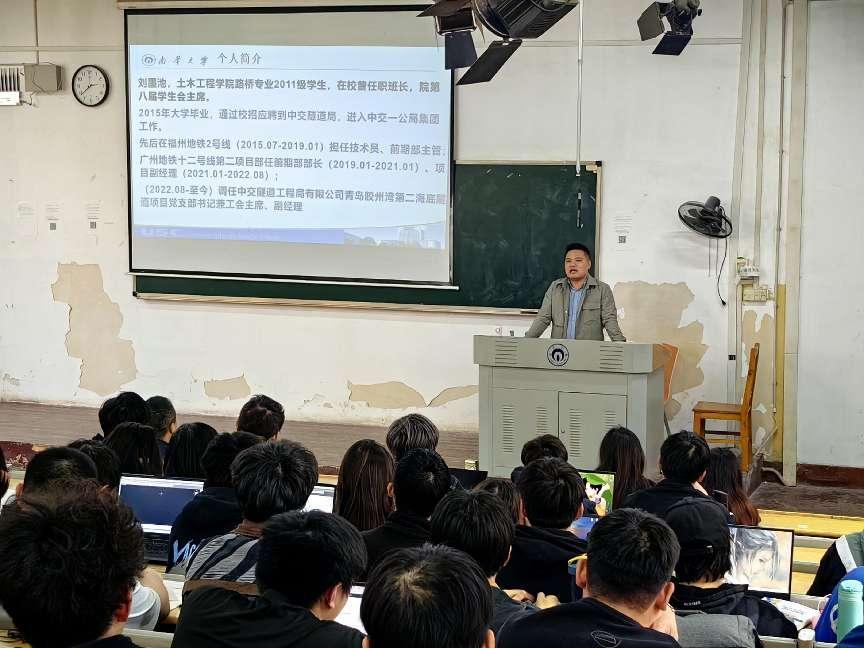 2023年3月13日下午14时30分,时任中交隧道工程局有限公司青岛胶州湾第二海底隧道项目党支部书记兼工会主席、副经理的我院2011级优秀校友刘墨池应邀参加“薪火相传筑梦未来”的交流会。英国365集团路桥系副教授李明老师、辅导员刘华老师、路桥专业20级近百名同学参加会议。