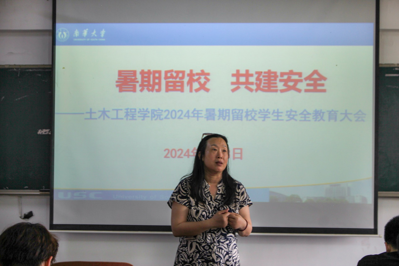最后,唐素芝老师在讲话时强调,安全问题事关重大,不容有丝毫懈怠,应时刻铭记于心。同学们要强化安全意识,保持联系畅通,严格遵守暑期校园、寝室、实验室各项管理规定。同时,她嘱咐同学们应时常向家长、老师报告自身安全情况,以减轻他们的担忧。对于学生会干部,她要求学生干部们要树榜样、立标杆,履行应尽职责,发挥模范带头作用。希望同学们要珍惜留校学习的机会,度过一个安全、健康、快乐的暑假。