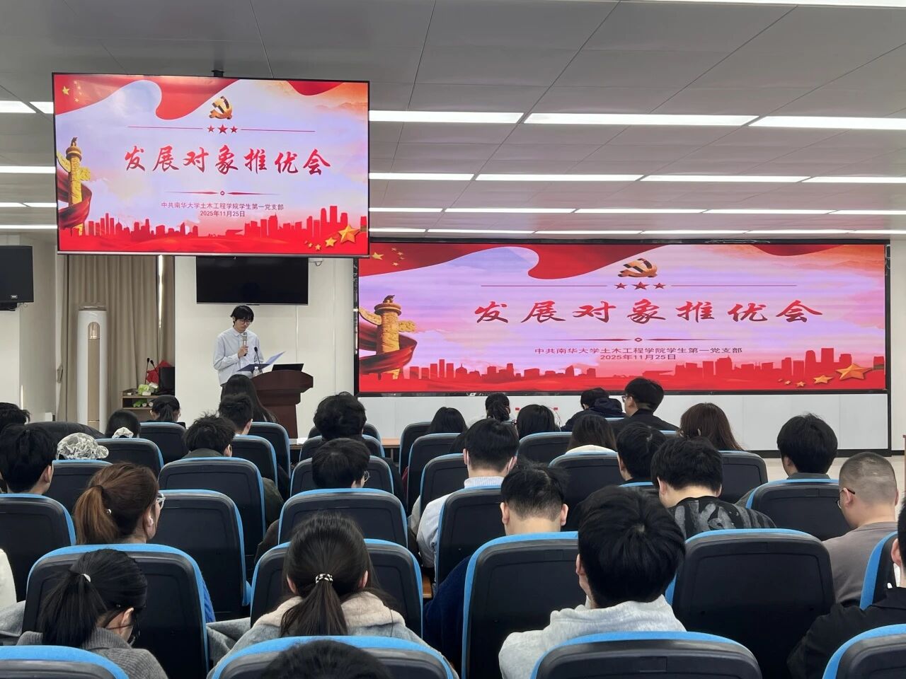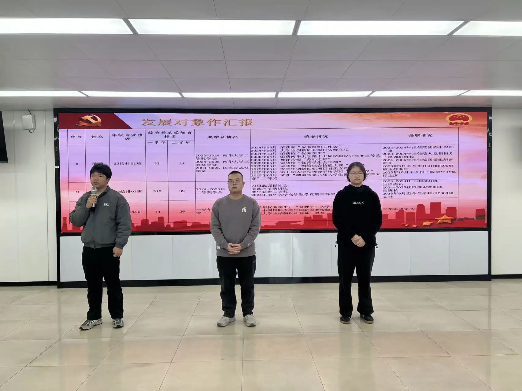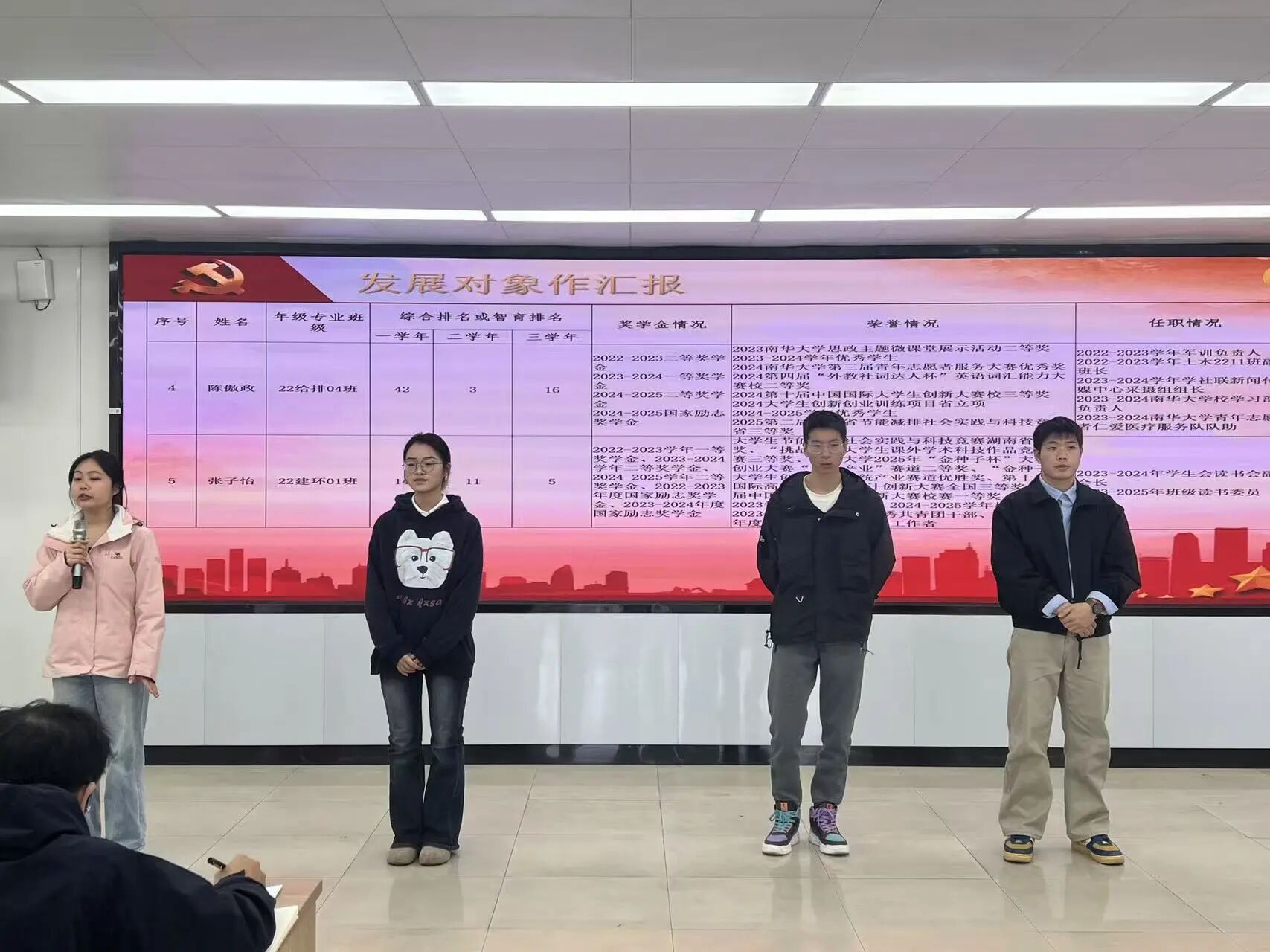 2025年11月25日下午15:00,英国365集团学生第一党支部于土木楼六楼会议室顺利召开2025年秋季发展对象推优入党、群众座谈会。出席本次会议的成员有党支部书记贺淑珍同志,辅导员严铖磊老师,英国365集团学生第一党支部党员,2022、2023级给排建环群众代表以及发展推优对象。会议由罗佳棋同志主持。