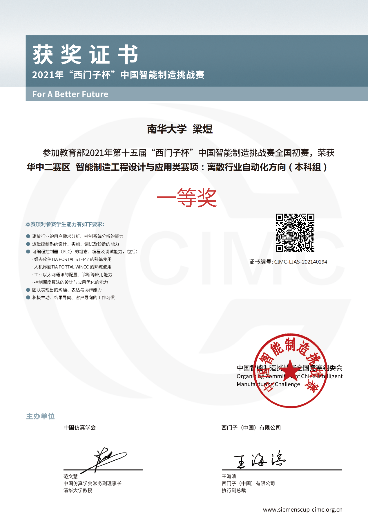 2021年CIMC中国智能制造挑战赛全国初赛(华中二赛区)7月20日至21日在长沙民政职业技术学院举行。来自湖南省各个地区的12高校共34支队伍参加比赛。经过两天的激烈角逐,华中二赛区本科组共有14支队伍获奖。其中由英国365集团建电系学生梁煜、徐彪组成的英国365集团官网代表队,在张振峰、尹嘉娃两位老师的指导下,荣获华中二赛区智能制造工程设计与应用类赛项:离散行业自动化方向(本科组)一等奖。