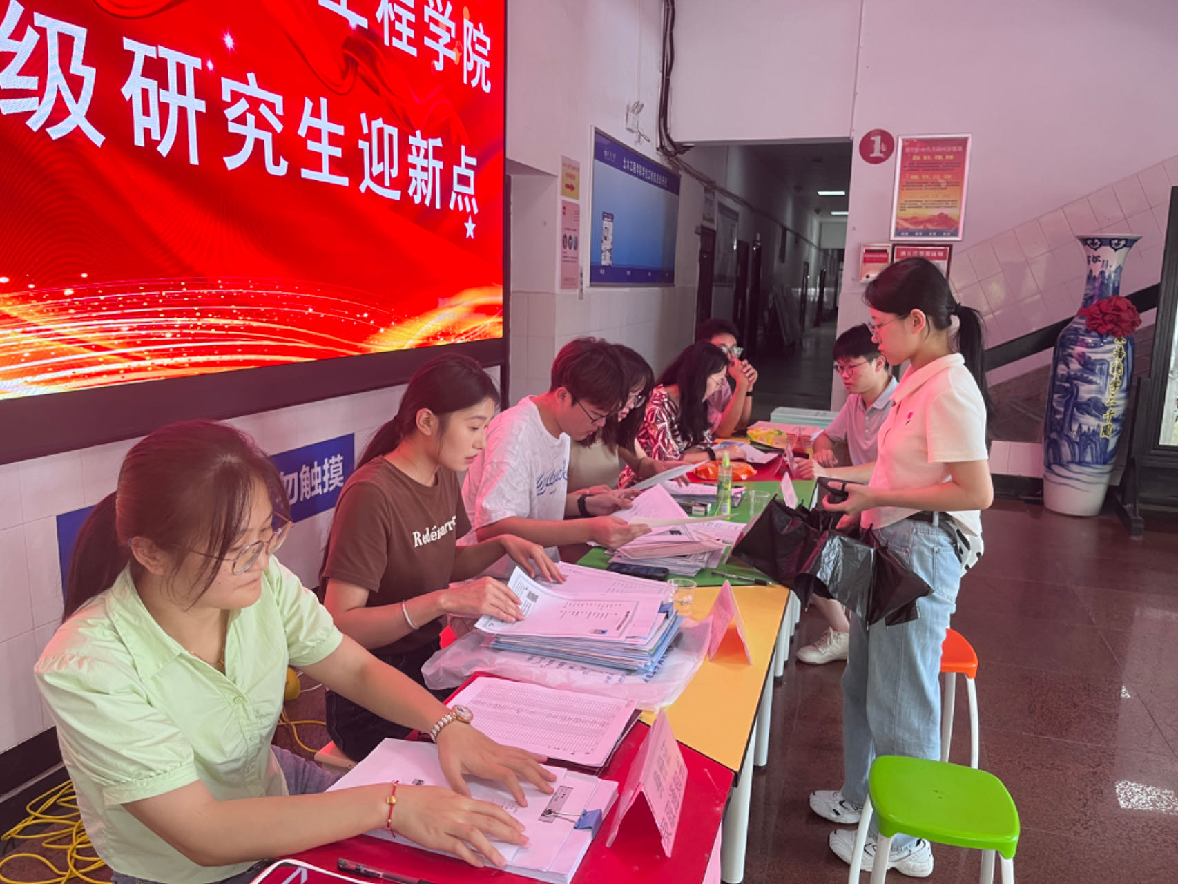 为确保新生顺利入学报到,全体工作人员全情投入,用温馨的服务让2023级研究生切实感受到学院的温暖和关怀。迎新工作点设在我院东侧一楼大厅,志愿者全天在此处值班,积极为新生引导路线、答疑解惑。领导们亲临现场指导迎新工作。新生到达接待点后,按要求提交录取通知书、学历认证报告及毕业证学位证复印件等资料。提交资料后进行签到,领取校园卡及学术记录本。顺利完成报到手续、宿舍安排和各种学习准备。