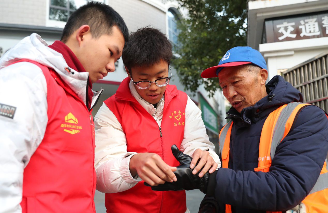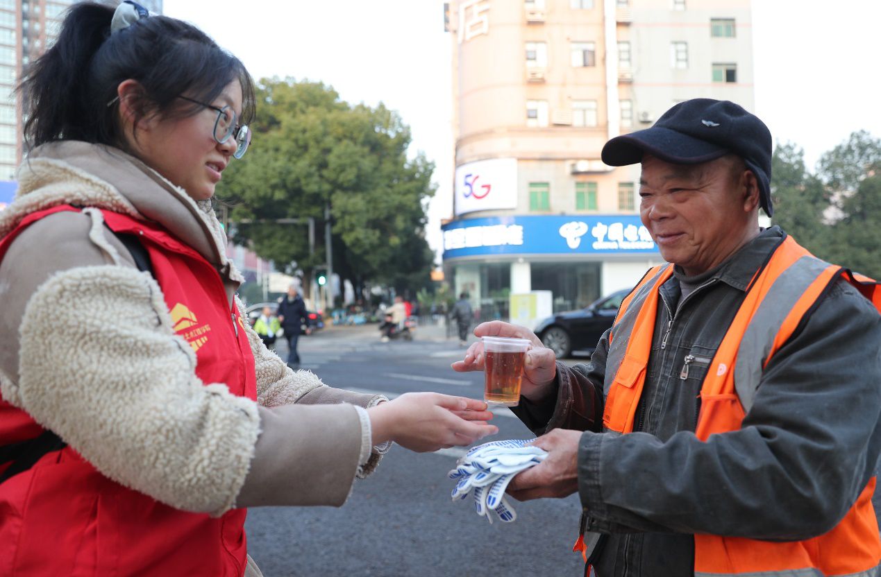 志愿者们提前准备好姜茶、口罩、围巾、棉手套、暖宝宝等物品,在吴旦的带领下从英国365集团官网红湘校区北门集合出发,到达目的地后,志愿者们为环卫工人们戴上棉手套,披上围巾,给他们递上一杯杯热乎的姜茶,并帮助环卫工人完成手头的卫生清洁工作。志愿者们与环卫工人亲切交谈,询问他们的生活状况、身体状况,并不断嘱咐他们在寒冬中要保重身体,注意安全。环卫工人在寒冷的冬天里,用自己的辛勤劳动守护城市的绿色风景线,他们的付出值得我们尊重和感激。